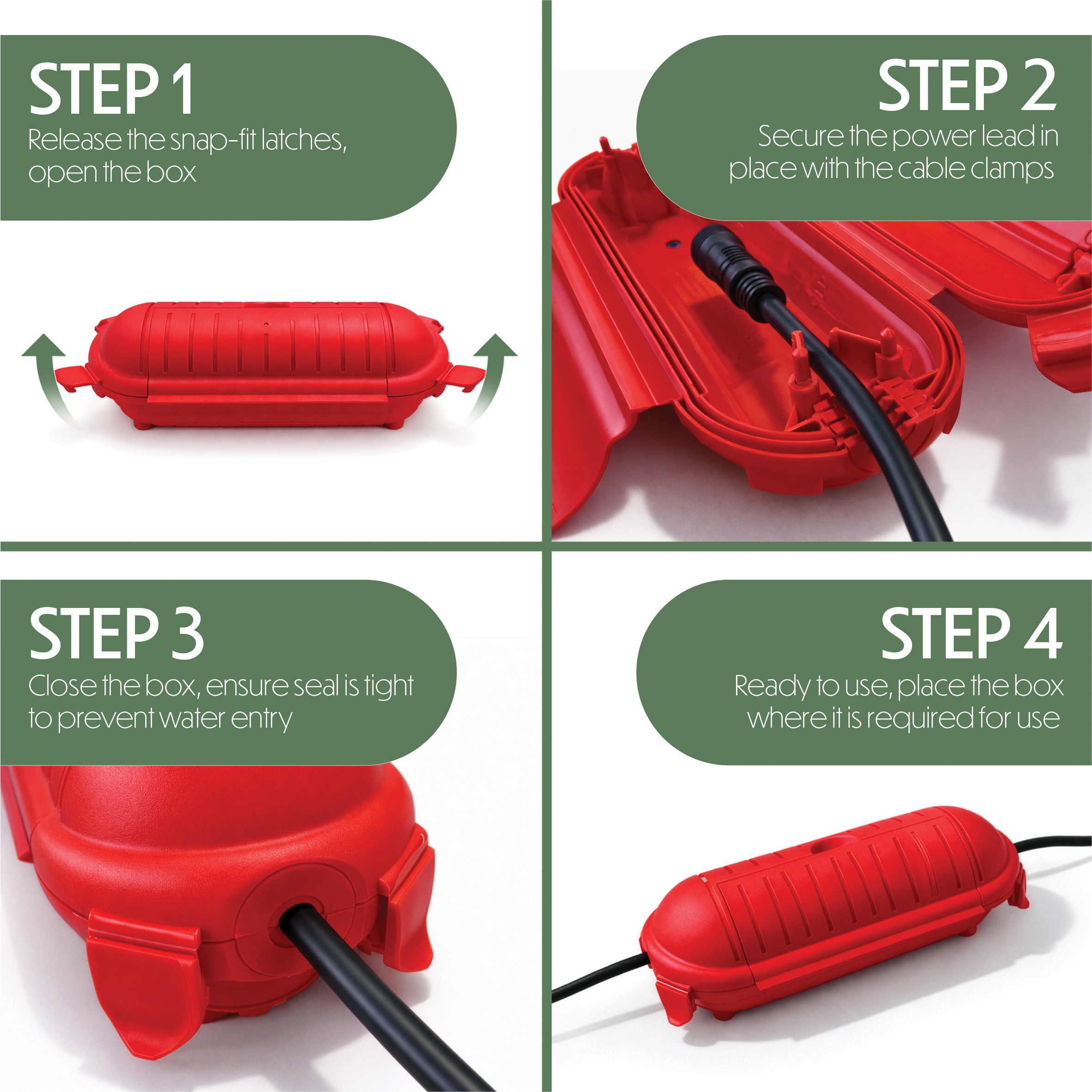 This safe box from Eagle is designed for connection of a single plug and socket (Extension lead not supplied).It comes with an IP44 Splashproof rating making it ideal for exposed areas. It is designed to protect power connections both indoors and outdoors. Helps reduce risk of electric shocks. A bonus feature is that it can be wall mounted with the two slots at the back (wall mounting accessories not included). There are two rubber entry holes for the cable at both entry and exit points. The storage of the plug aids with accidental plug and socket detachment. Suitable for a range of applications such as caravan and camping, to garden and household power tools.