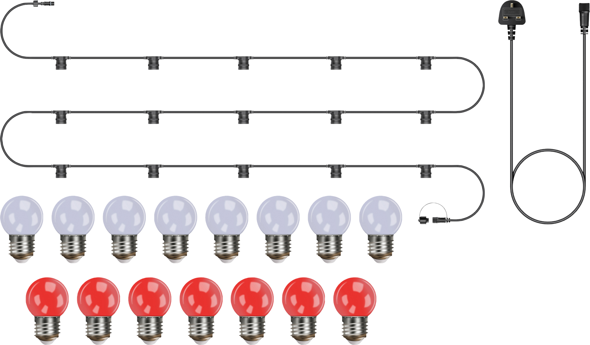 - Complete 5m Lighting Kit – Supplied with 15 x 2W ES golf ball lamps, including 8 white and 7 red bulbs, ready to install.