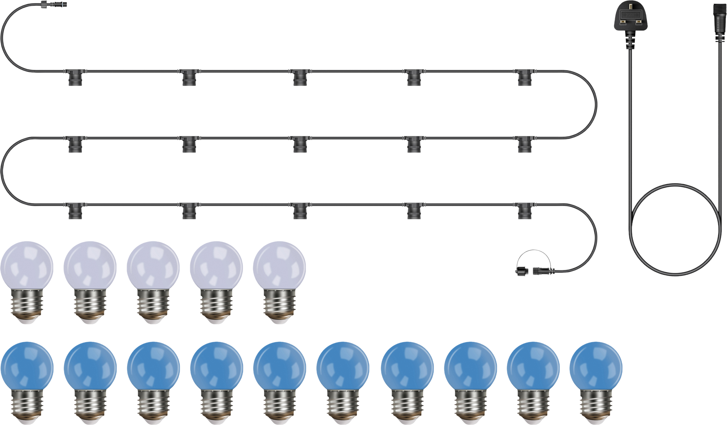 - Complete 5m Lighting Kit – Supplied with 15 x 2W ES golf ball lamps, including 10 blue and 5 white bulbs, ready to use.