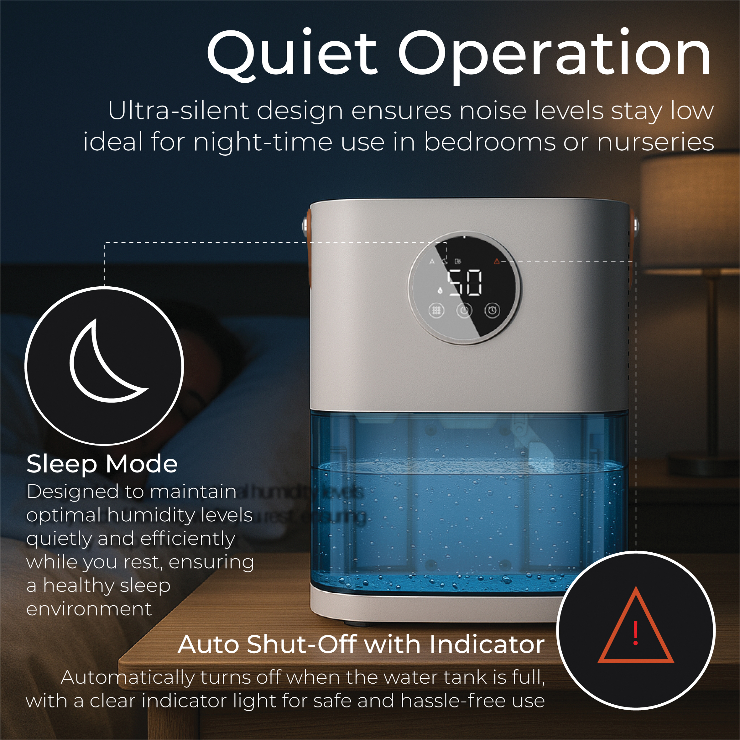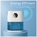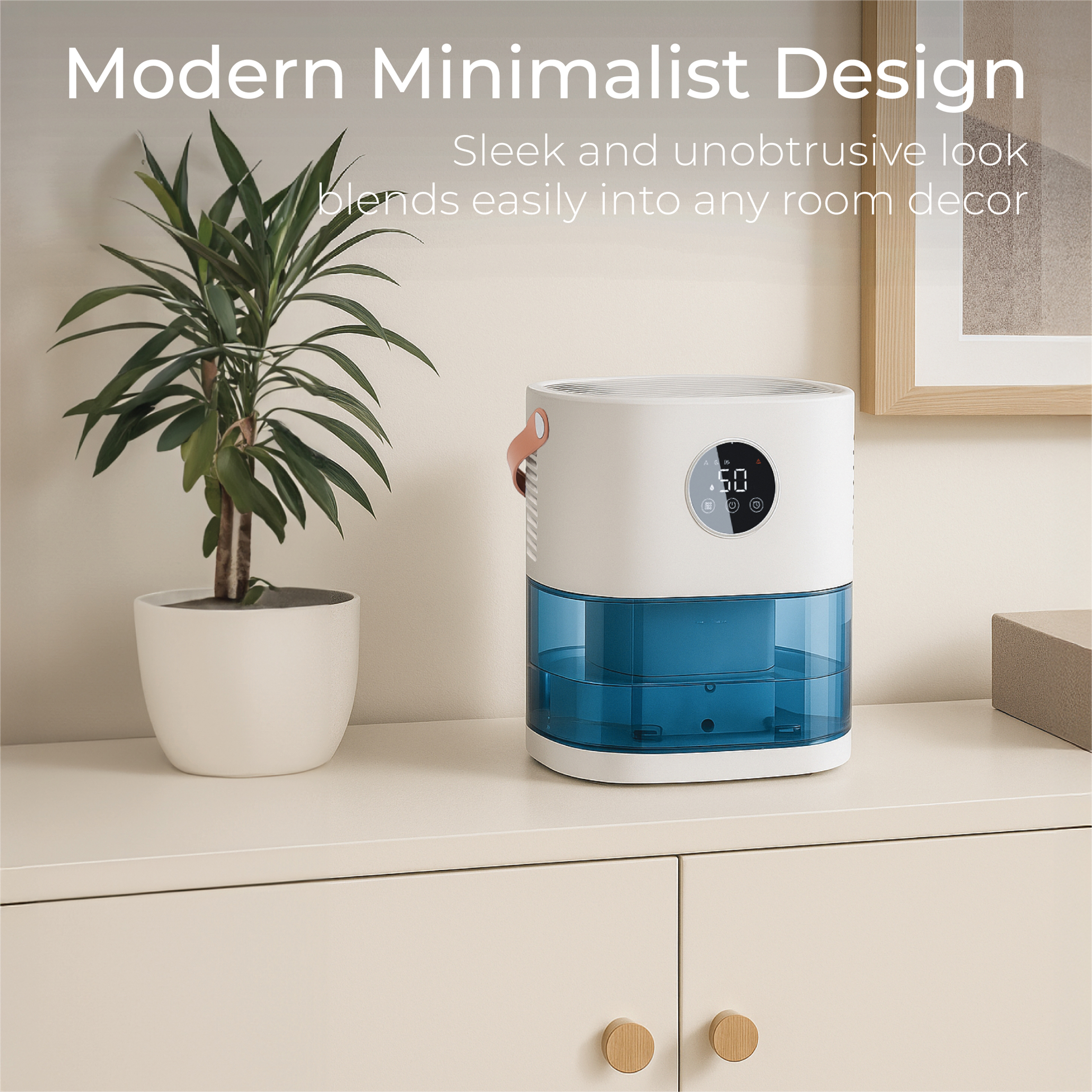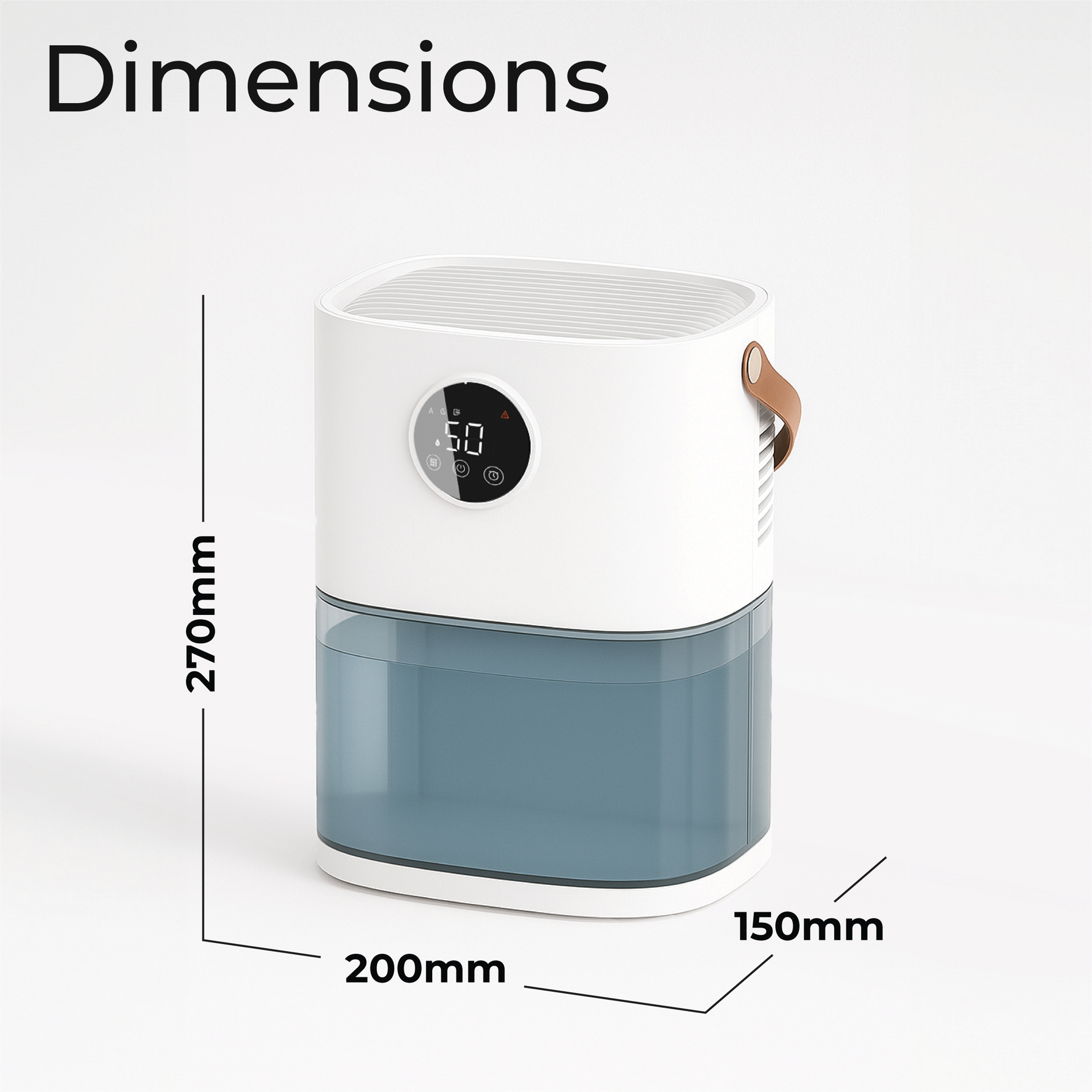 The Prem-i-air Smart Dehumidifier offers quiet, energy-efficient moisture control with a 1.9L tank and 430ml/day capacity. Ideal for bedrooms and offices, it runs at just 47dB and uses only 25W, featuring auto humidity detection that activates based on RH levels. Equipped with sleep and turbo modes, adjustable timers (8/12/24h), full water and humidity indicators, it includes auto defrost, color-changing lights with on/off toggle, and a soft faux leather carry handle for portability. Designed in durable ABS plastic, it brings both performance and elegance to your space.