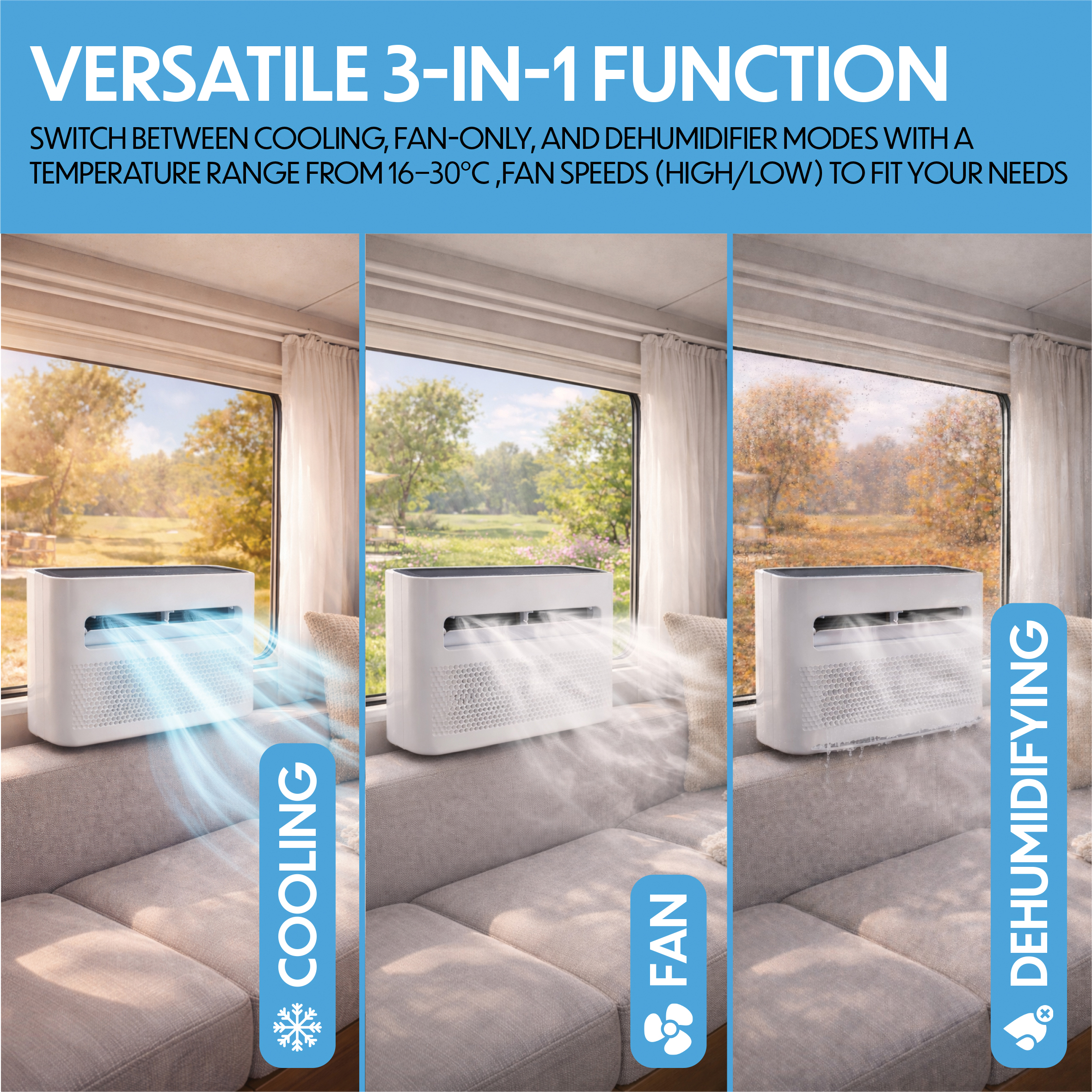 - Versatile 3-in-1 Functionality: Switch between cooling, fan-only, and dehumidifier modes with a temperature range from 16–30°C and fan speeds (high/low) to match your needs.