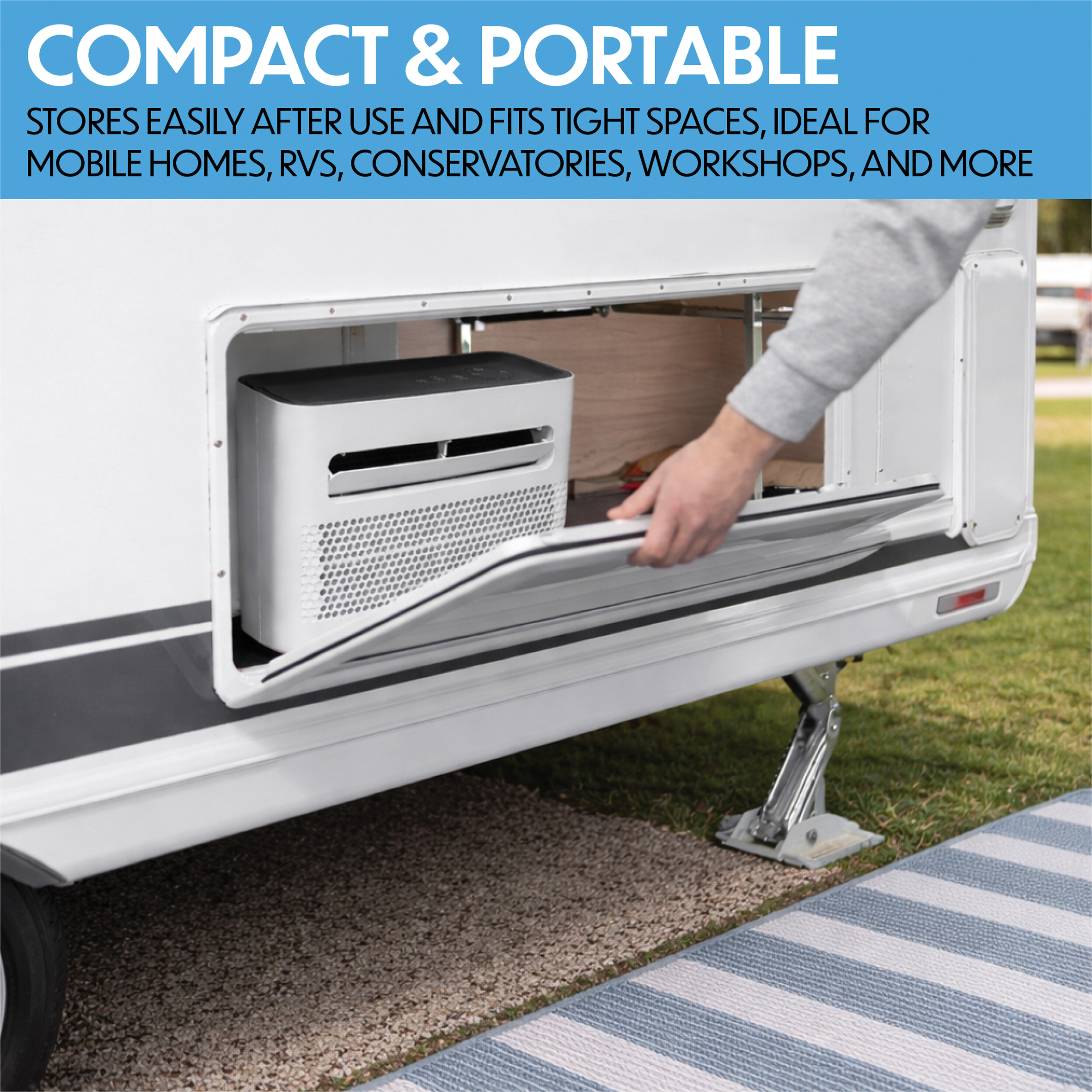 - Compact & Portable: Stores easily after use and fits tight spaces, ideal for mobile homes, RVs, conservatories, workshops, and more.