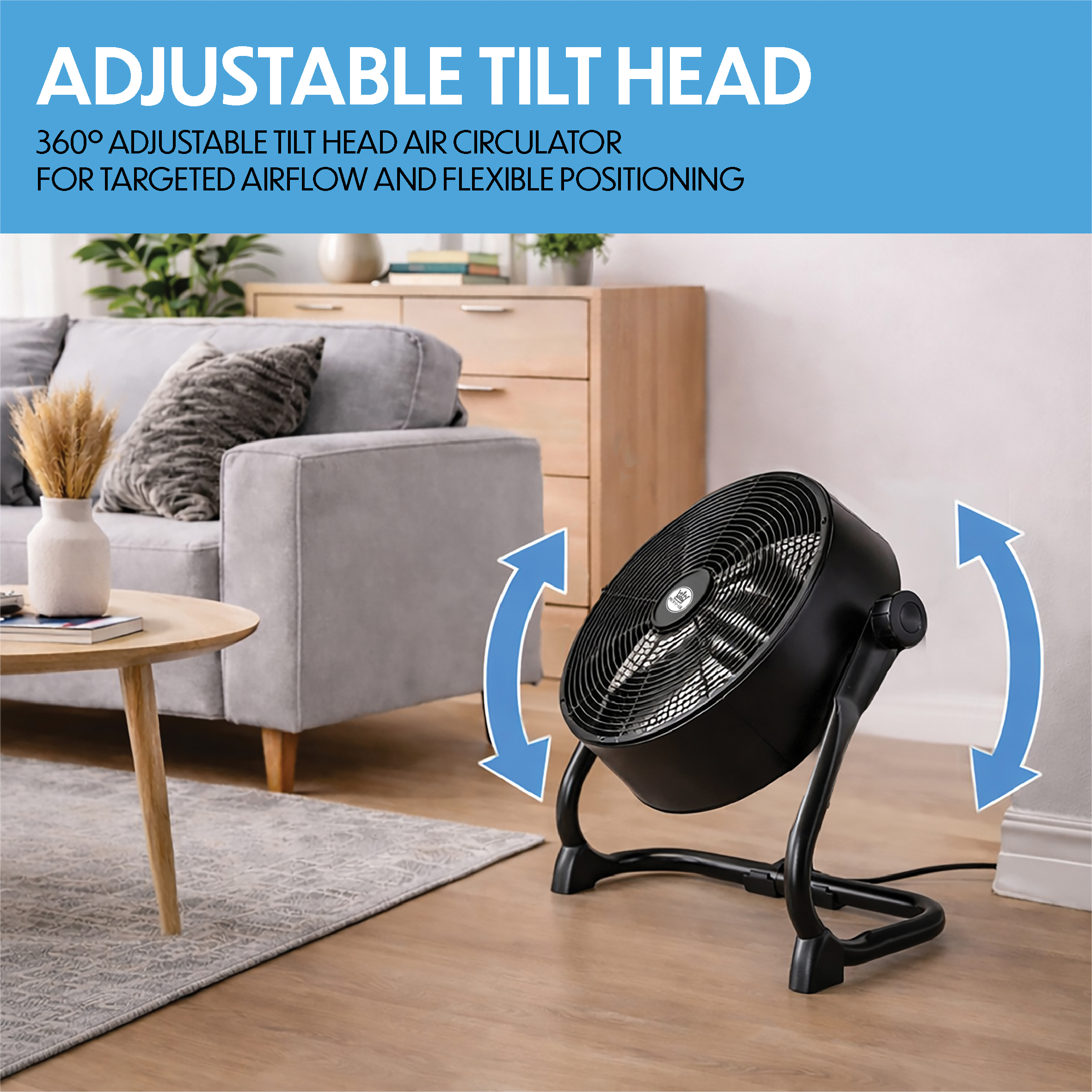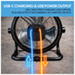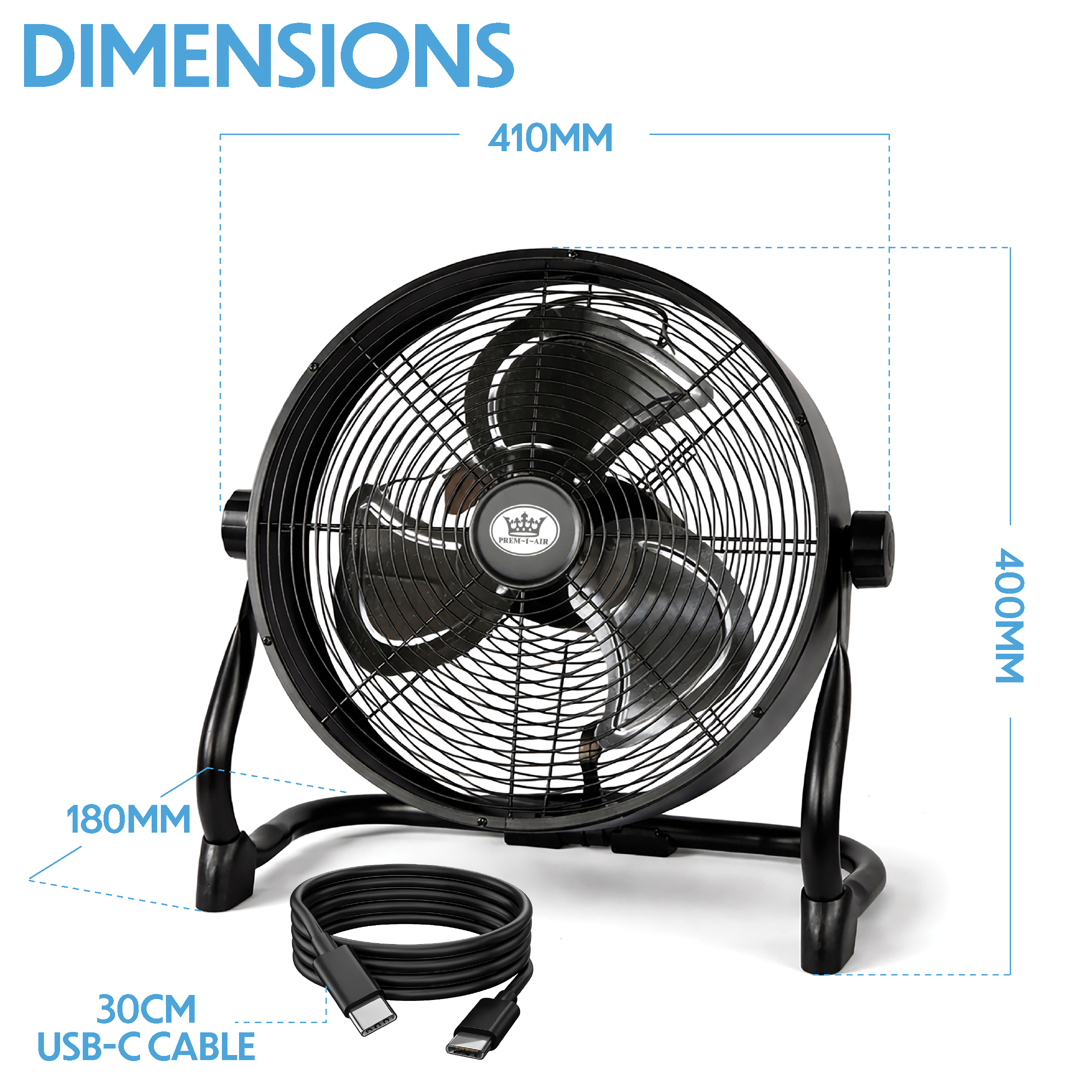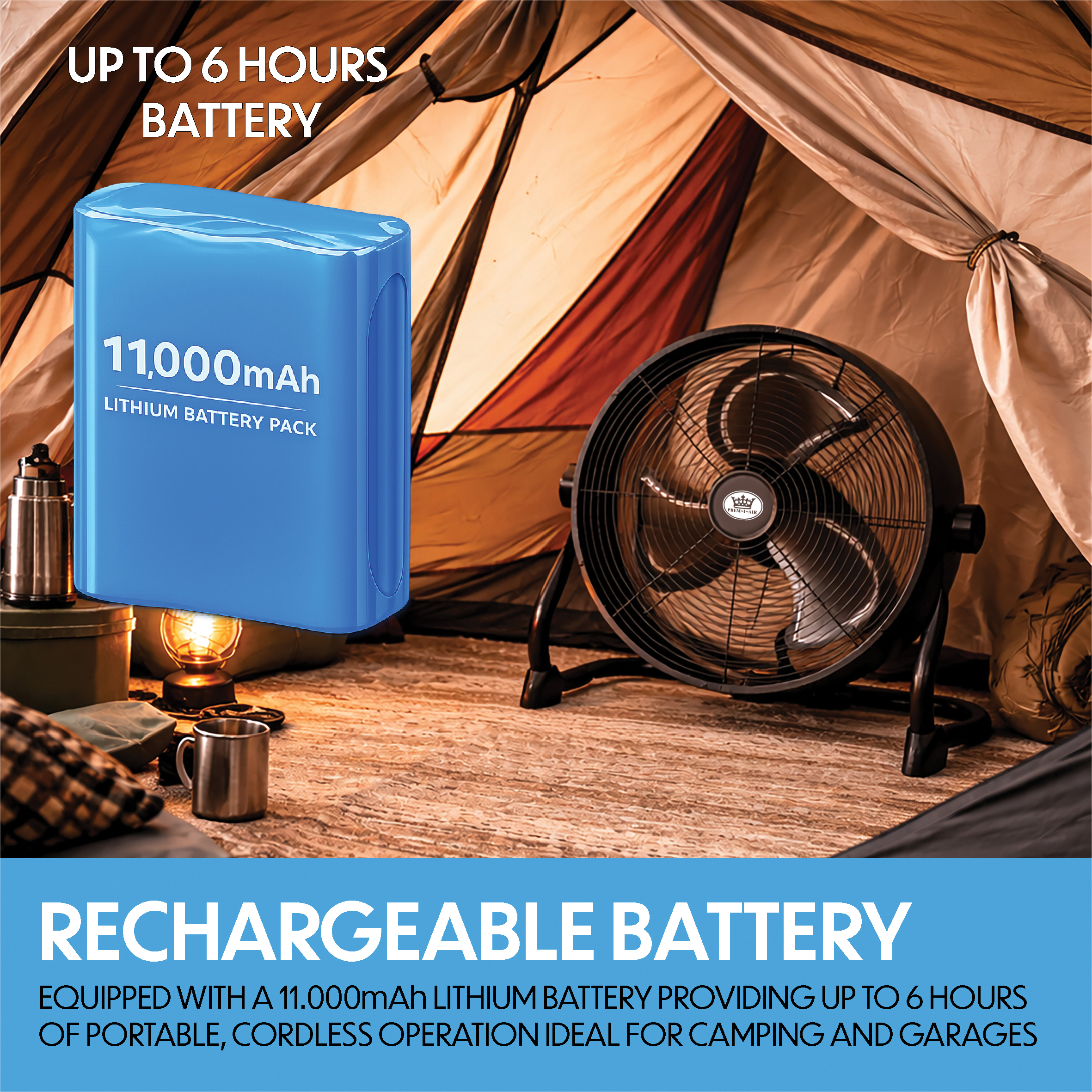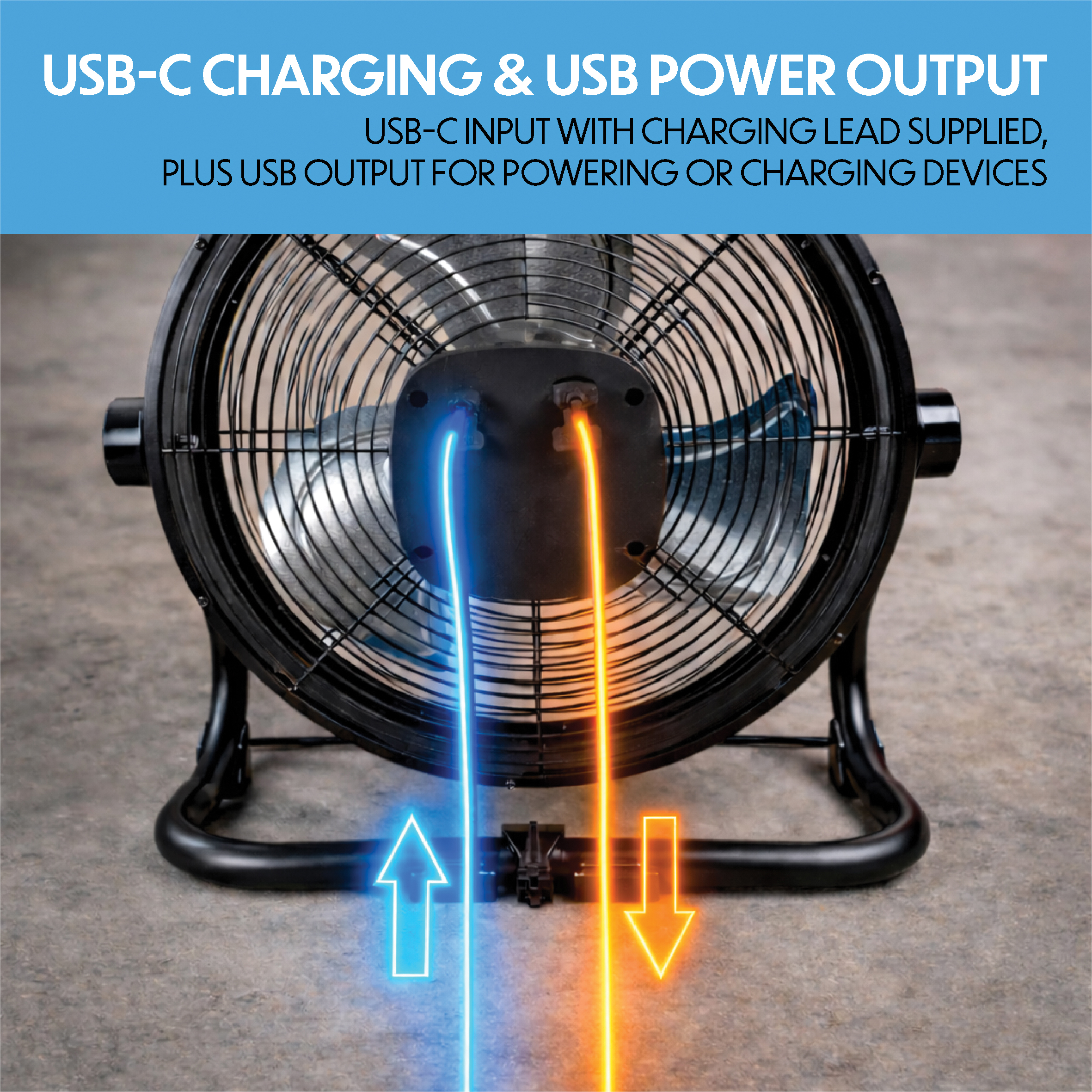 This 12" rechargeable air circulator fan delivers powerful, flexible airflow wherever you need it. Built with a durable metal construction, it features a tilting head for precise angle adjustment and a hanging bracket, allowing use on the floor or suspended from a suitable fixing point. Powered by a high-capacity 11,000mAh lithium battery, it offers up to 6 hours of cordless operation and includes a USB-C power input with charging cable supplied, plus a USB output to power other devices, making it ideal for home, work, camping, or emergency use.
