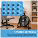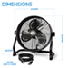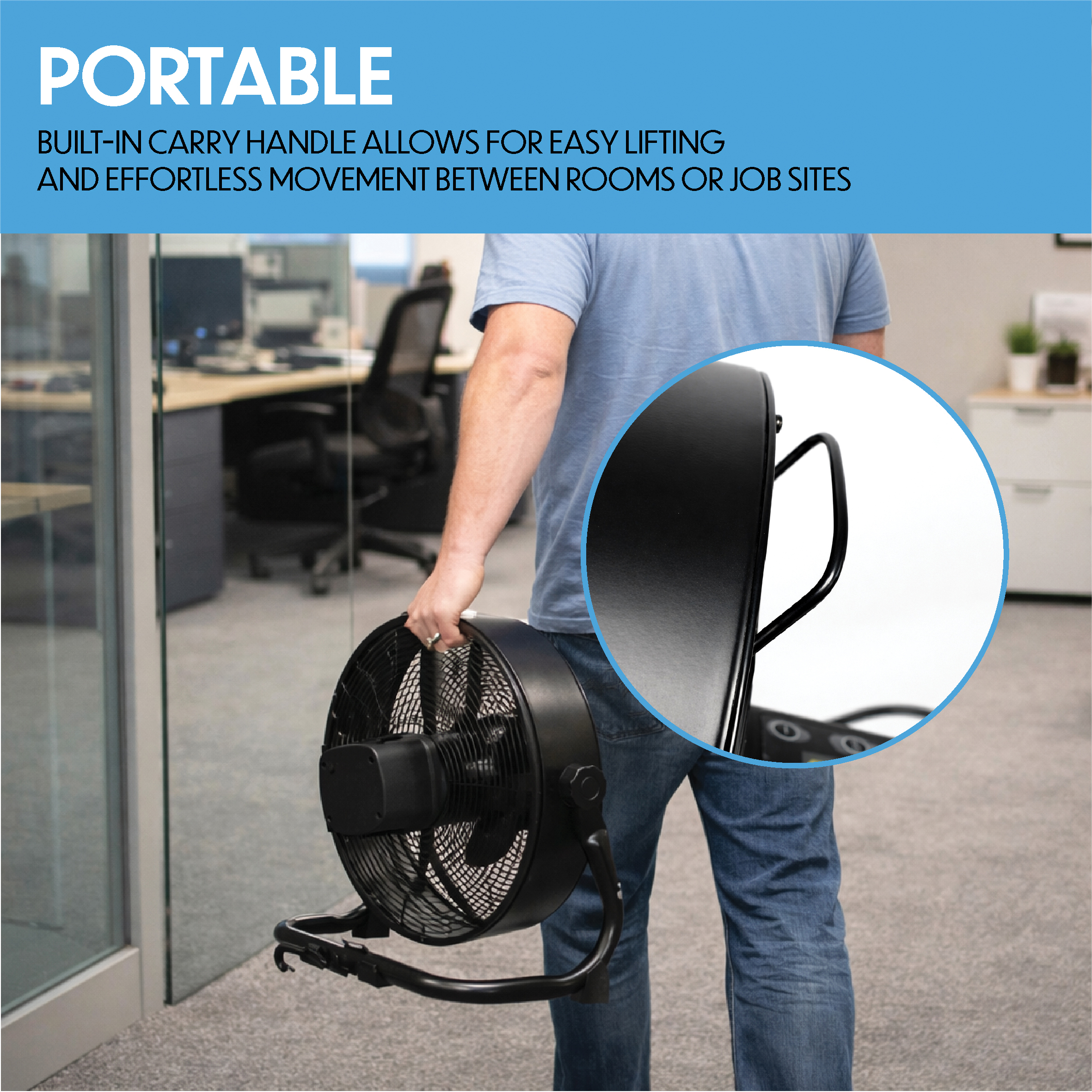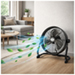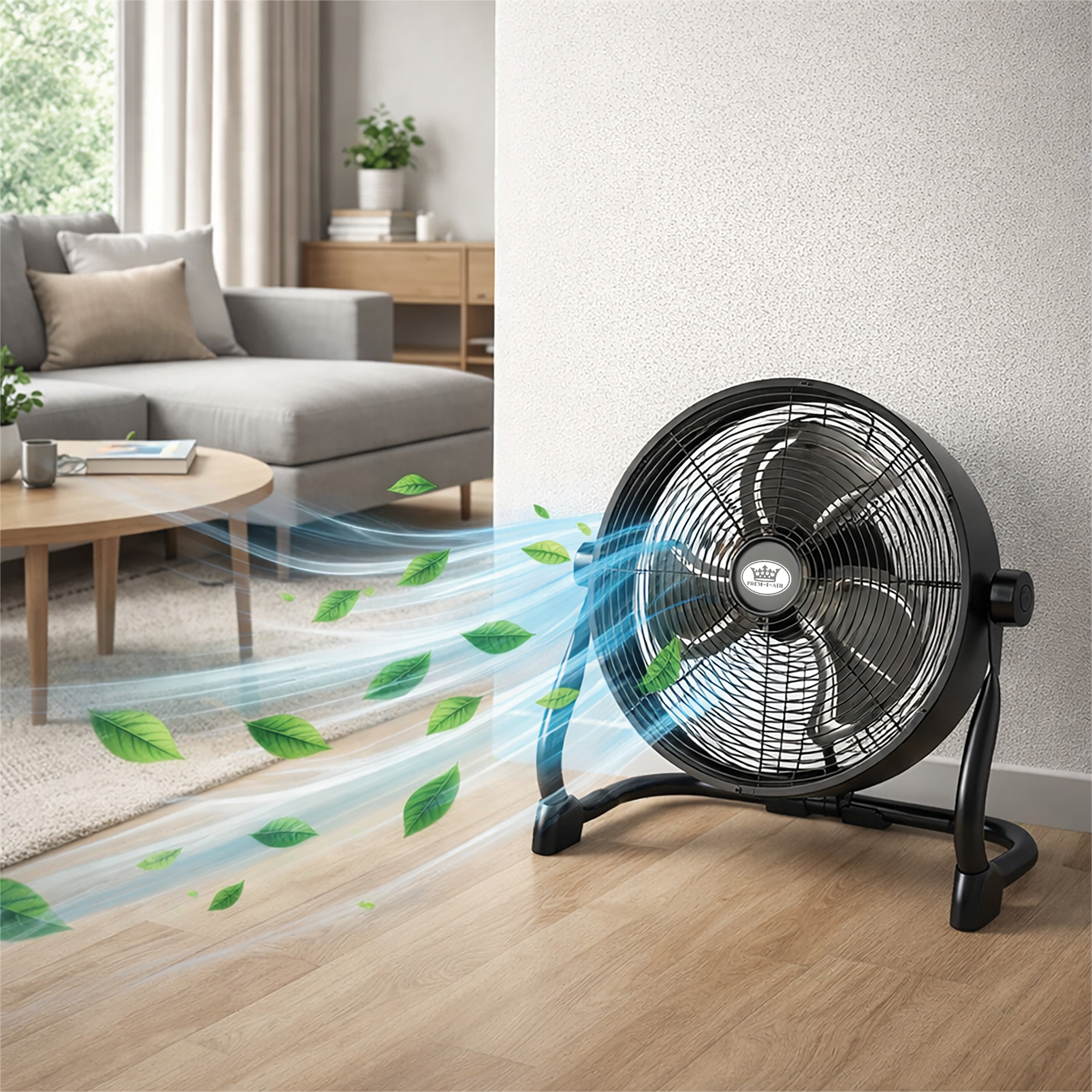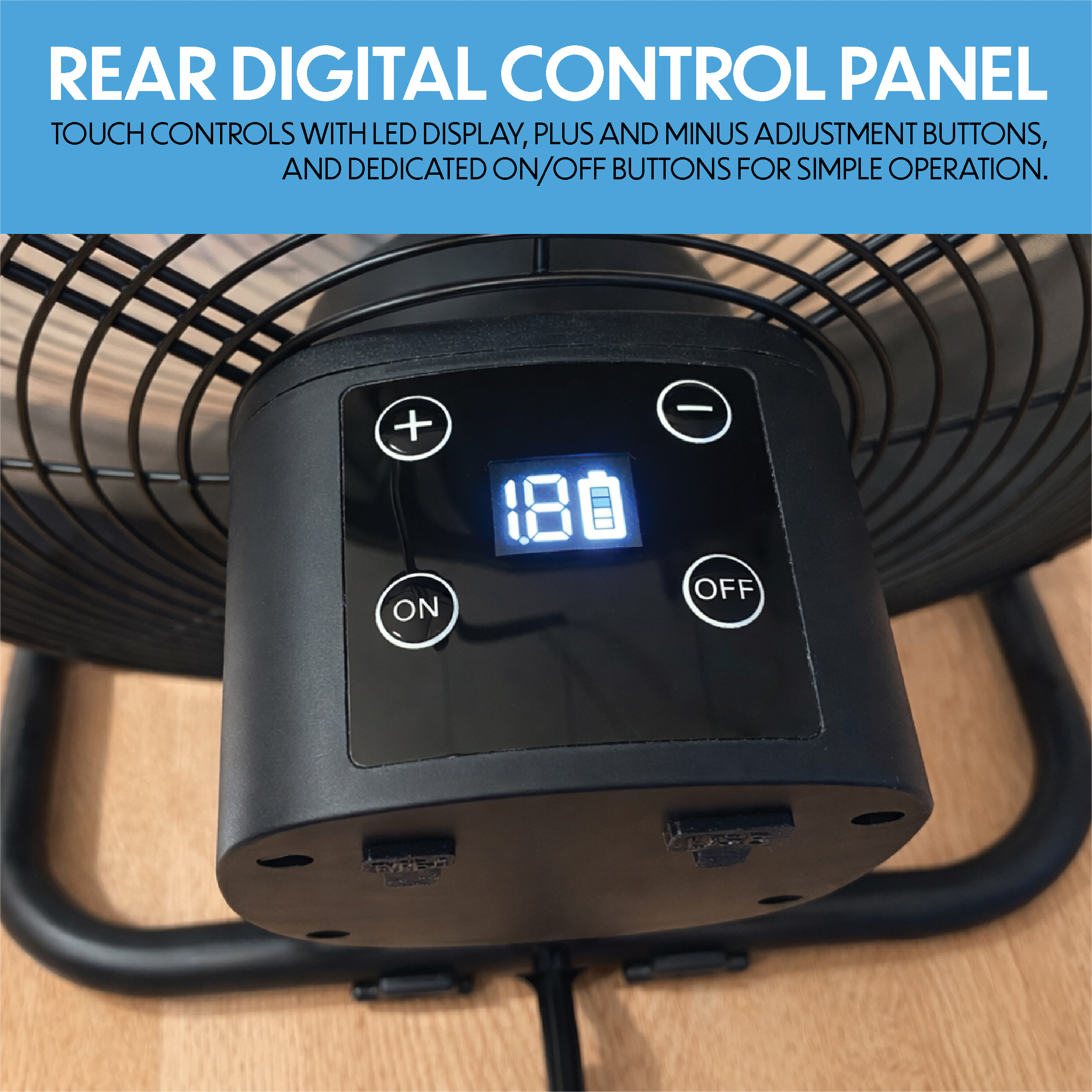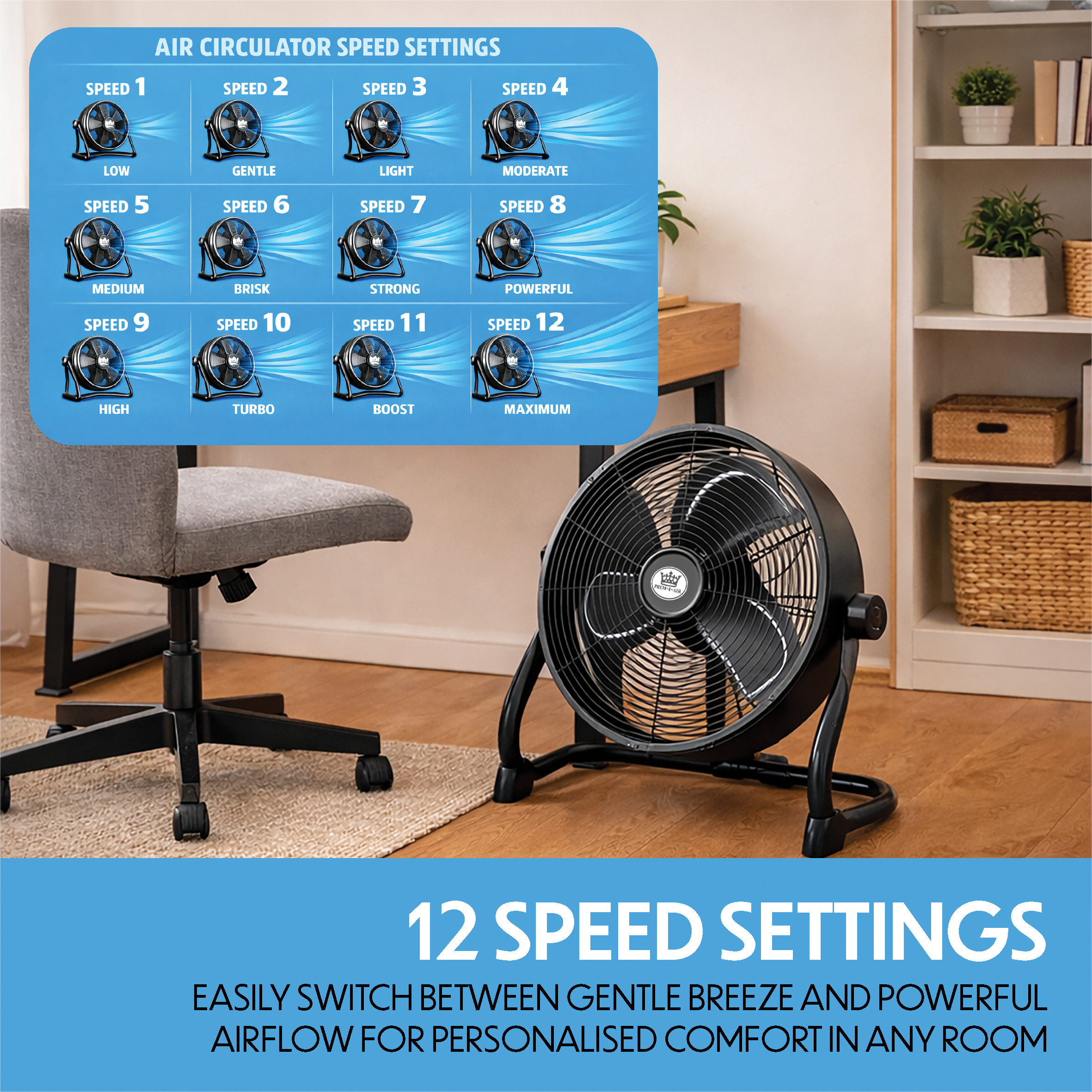 This 12" rechargeable air circulator fan delivers powerful, flexible airflow wherever you need it. Built with a durable metal construction, it features a tilting head for precise angle adjustment and a hanging bracket, allowing use on the floor or suspended from a suitable fixing point. Powered by a high-capacity 11,000mAh lithium battery, it offers up to 6 hours of cordless operation and includes a USB-C power input with charging cable supplied, plus a USB output to power other devices, making it ideal for home, work, camping, or emergency use.