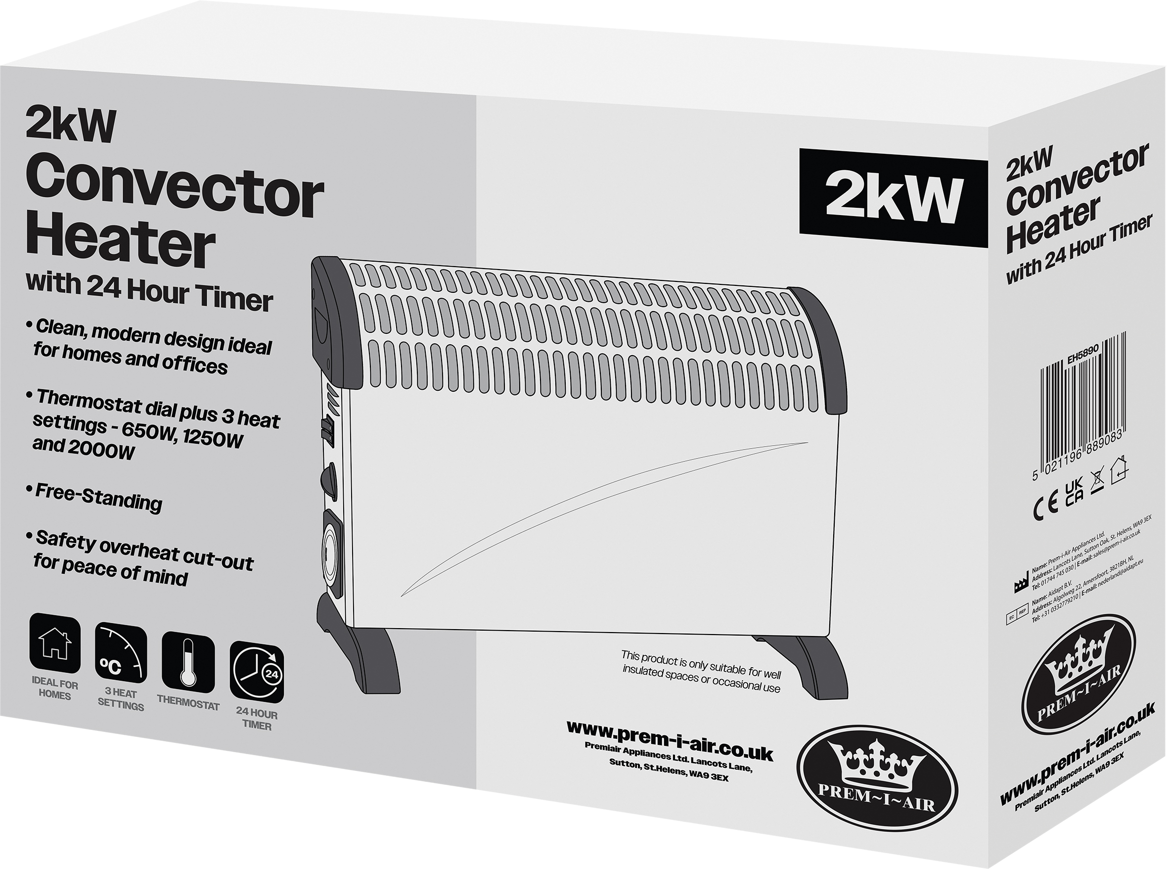 Prem-I-Air 2kW Convector Heater with 3 Heat Settings, 24-Hour Timer & Thermostat