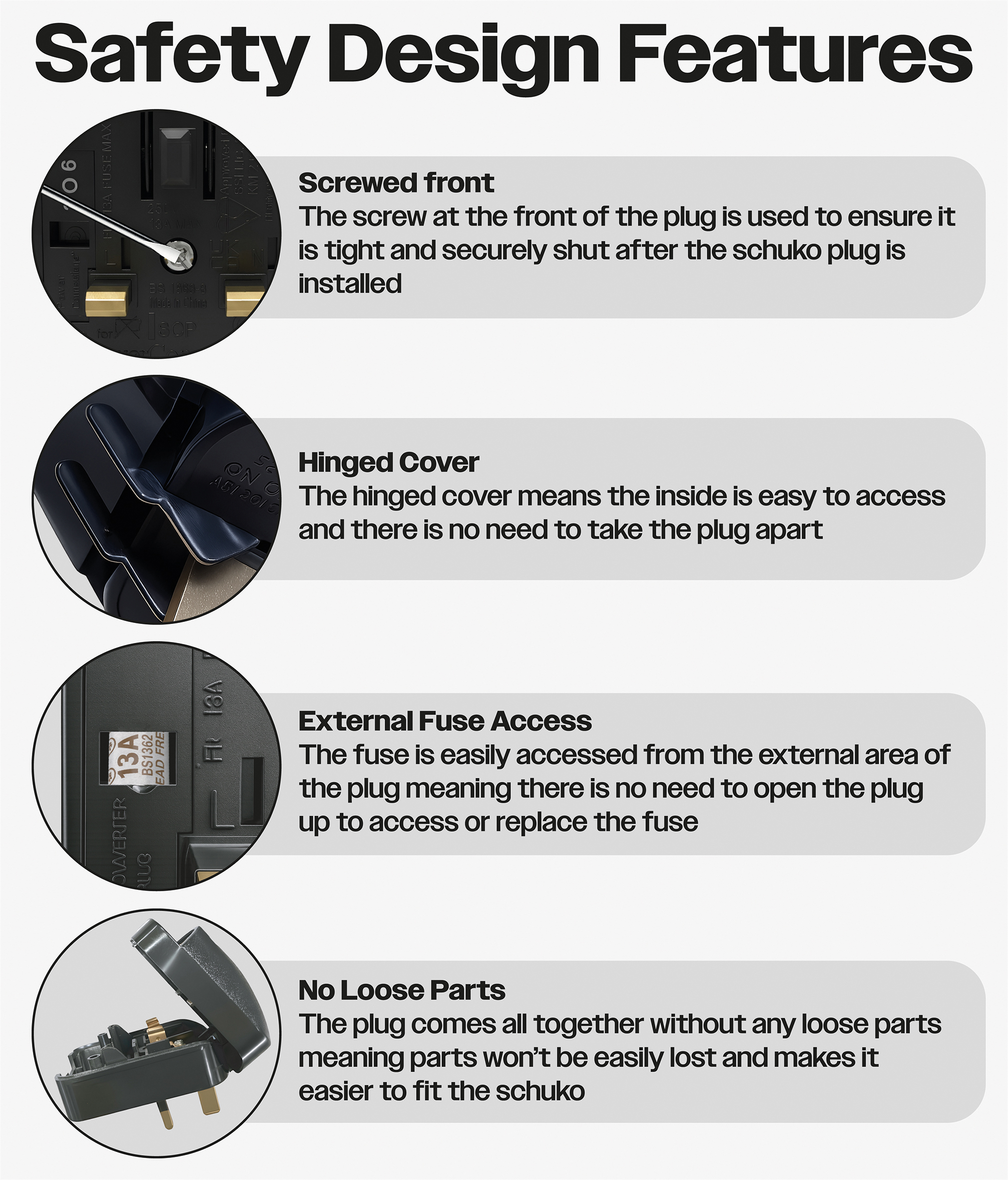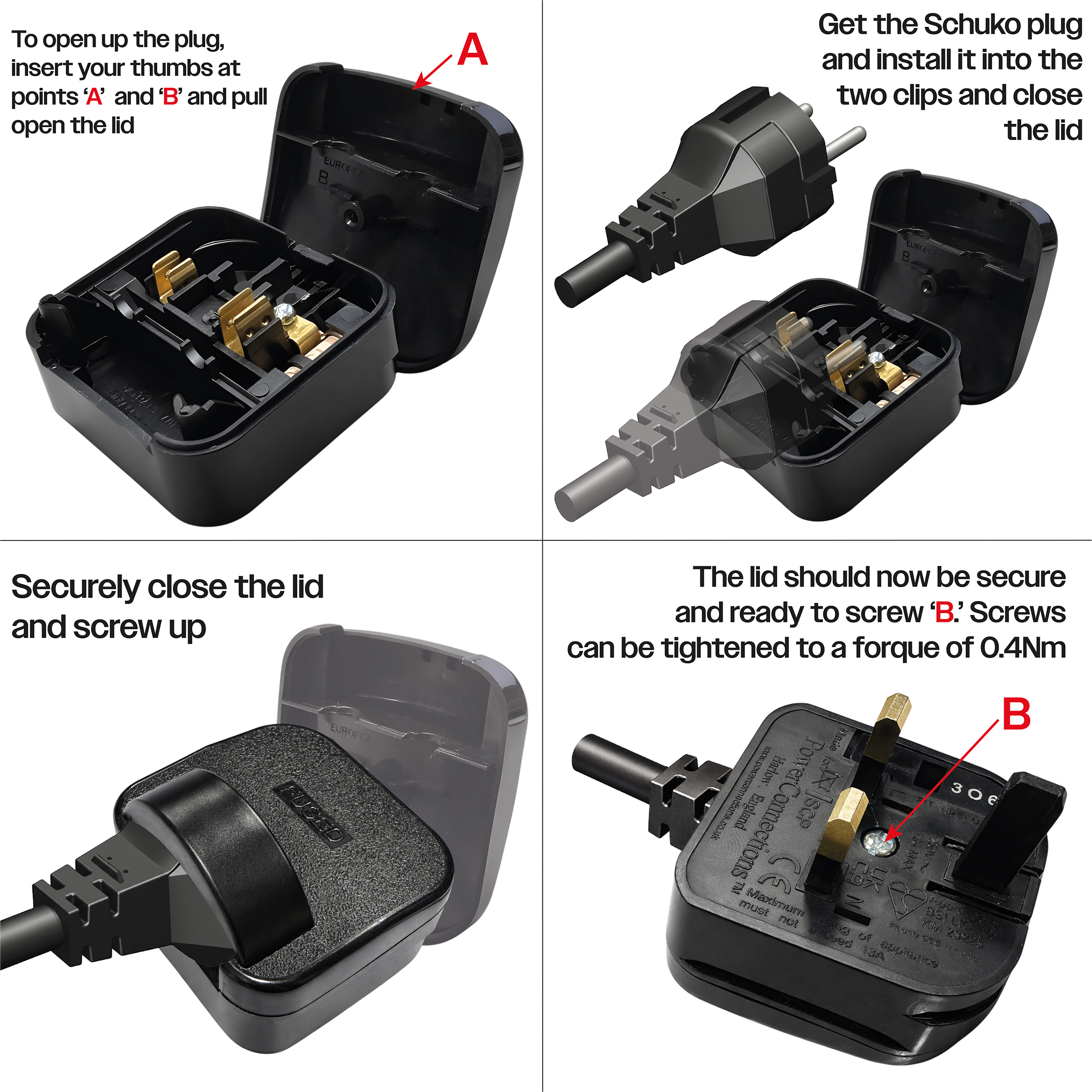 Converts an earthed Euro Schuko plug to a 3 Pin UK mains plug.