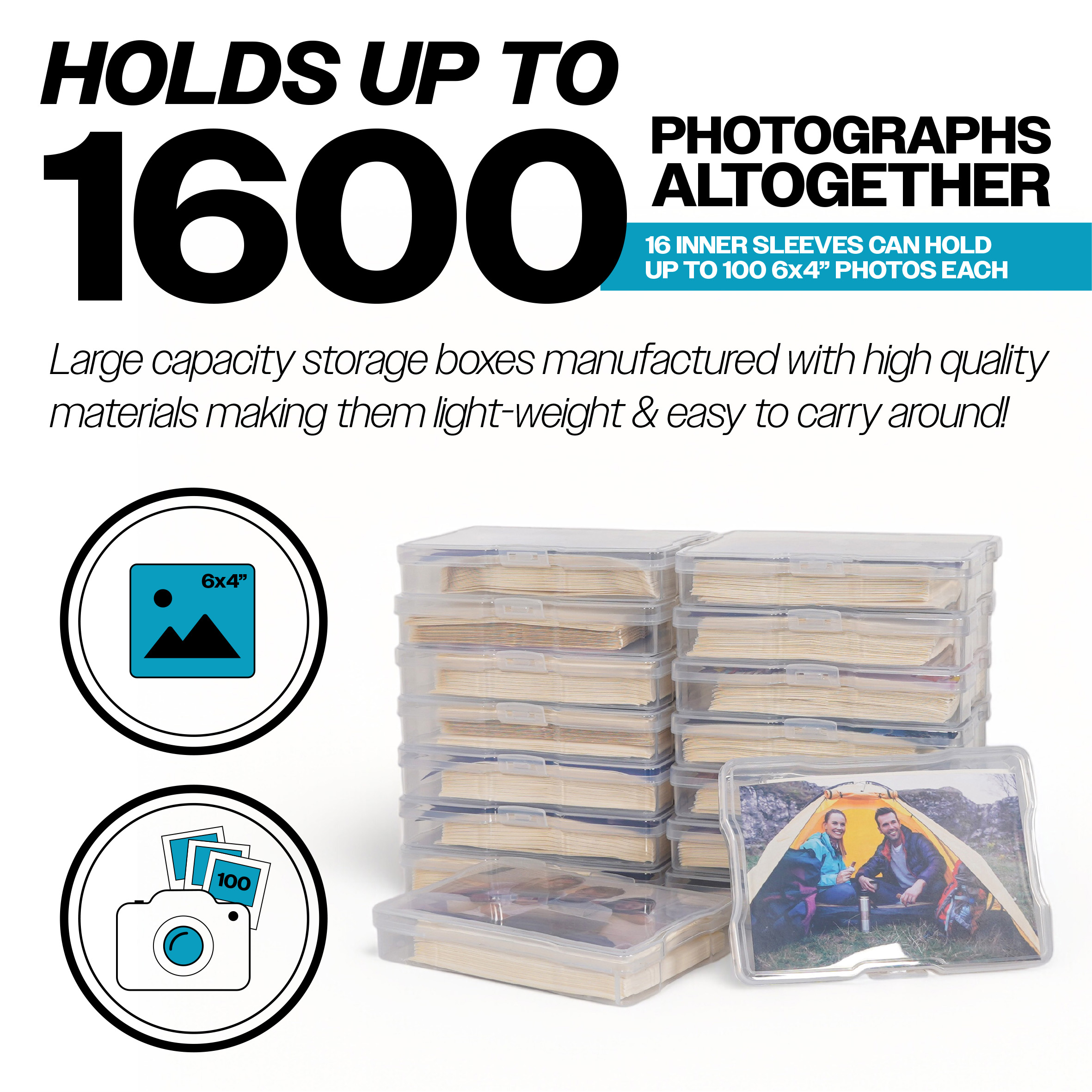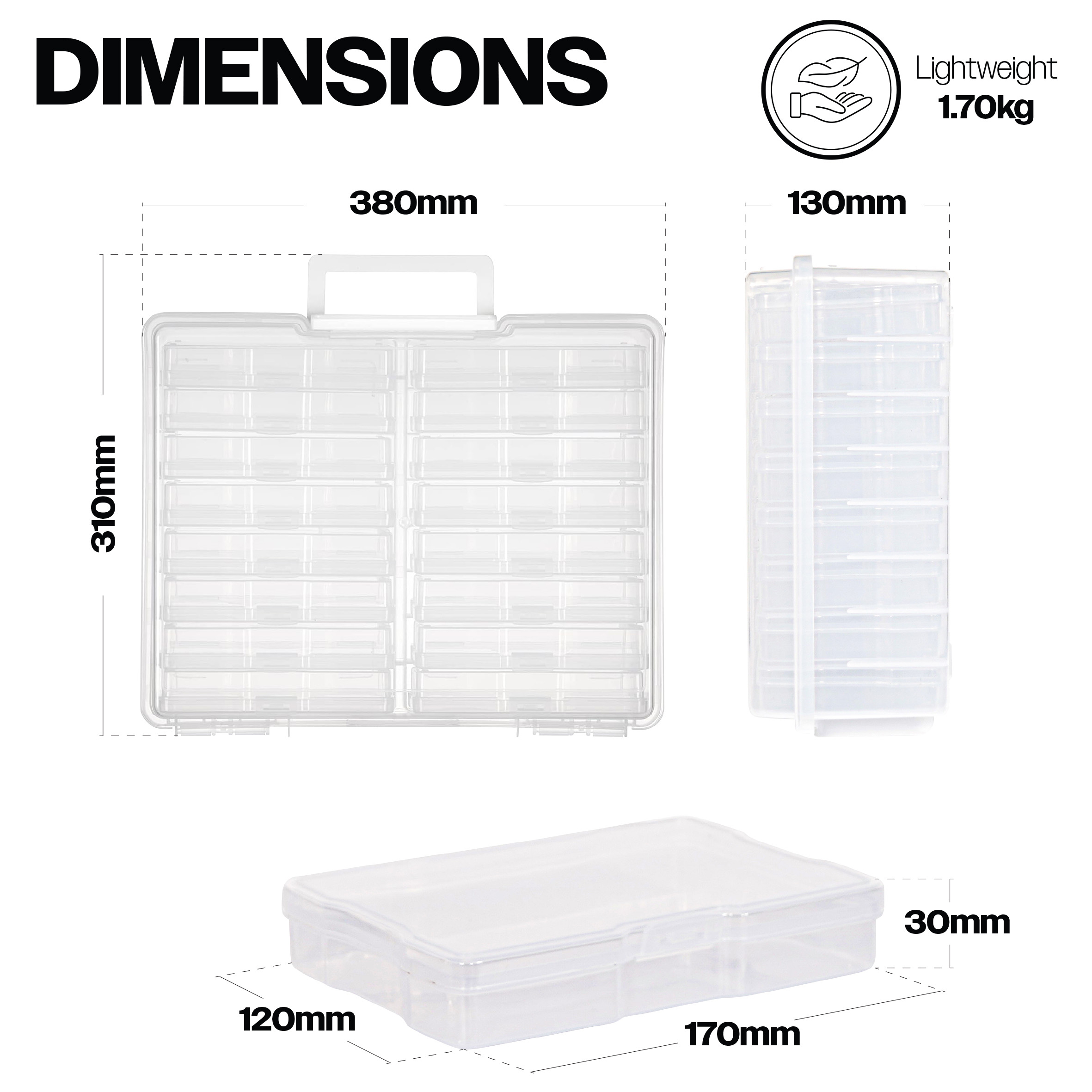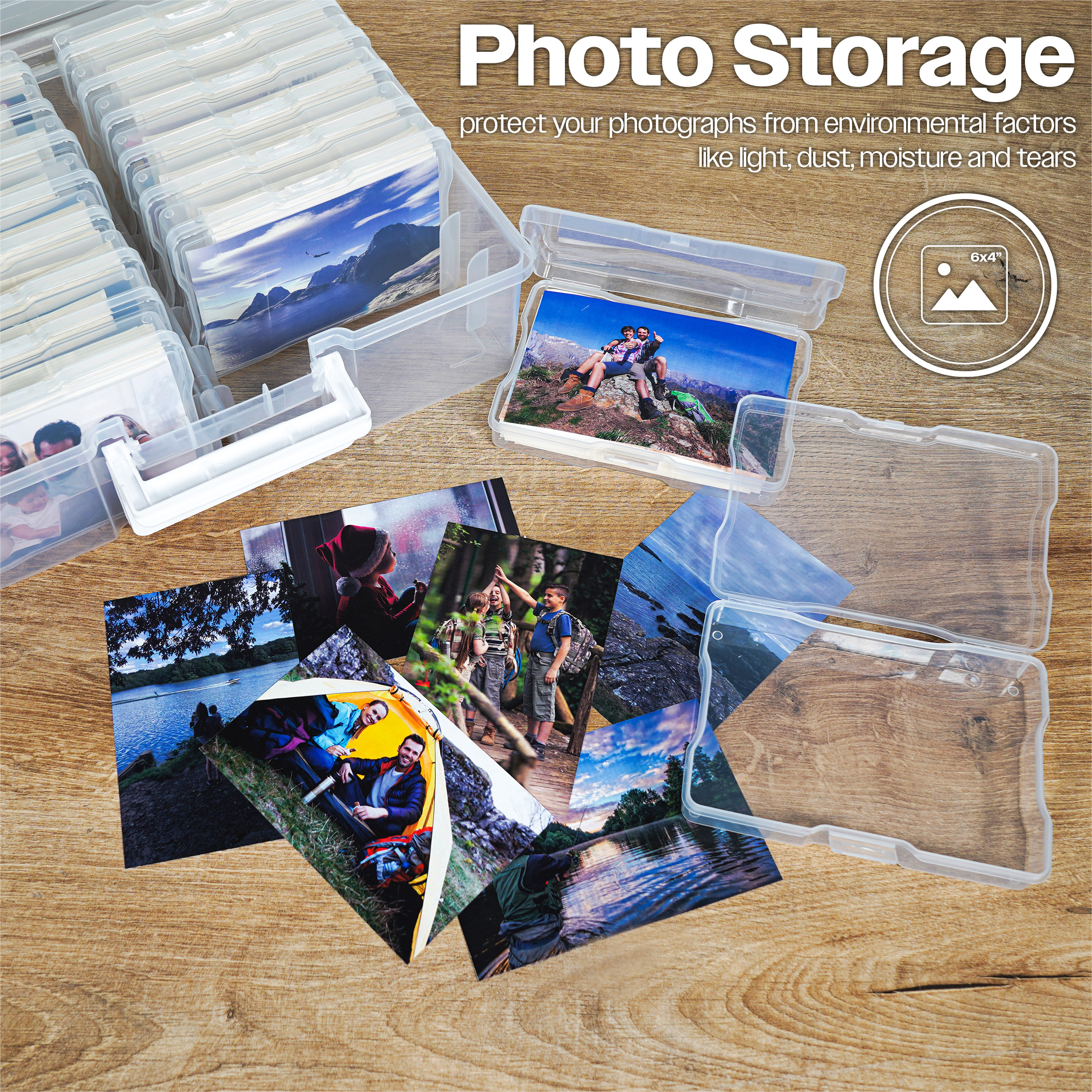 Keep your precious memories and small essentials safe and organized with this Photo Storage 4"x6" Case, supplied with 18 inner storage cases, each capable of holding 100 photos, for a total capacity of 1,800 photos. Made from clear plastic, both the inner and outer boxes provide easy visibility of contents. The outer box features a sturdy carry handle and a hinged lid with a secure clasp fastening on both the inner and outer cases, ensuring reliable protection. Designed for versatility, this storage box can also accommodate seeds, cards, craft supplies, buttons, small components, jigsaw puzzles, stickers, and stationery items. Crafted from durable PE material, it offers strong, robust protection against dust, spills, and damage, making it an essential organizer for any home or office.