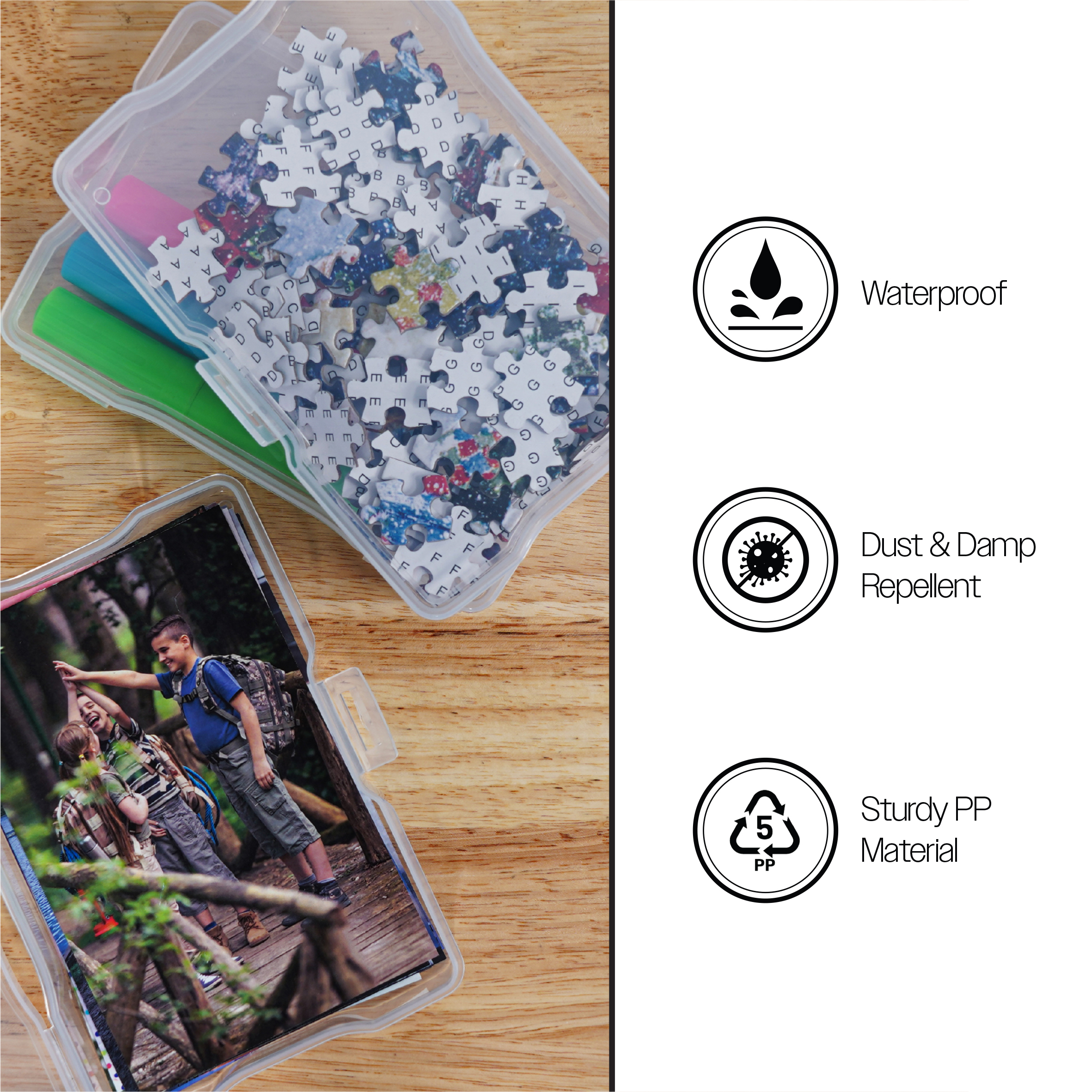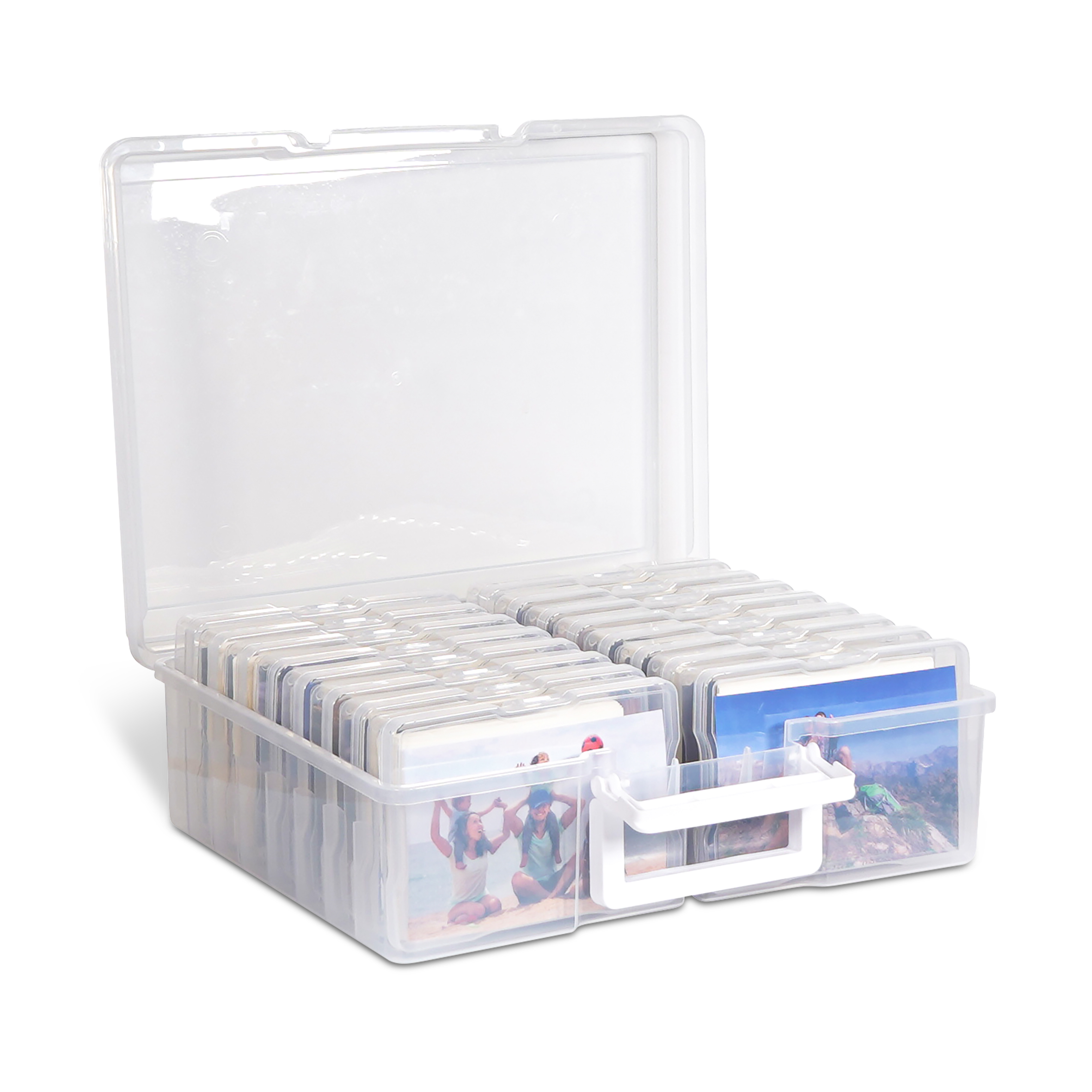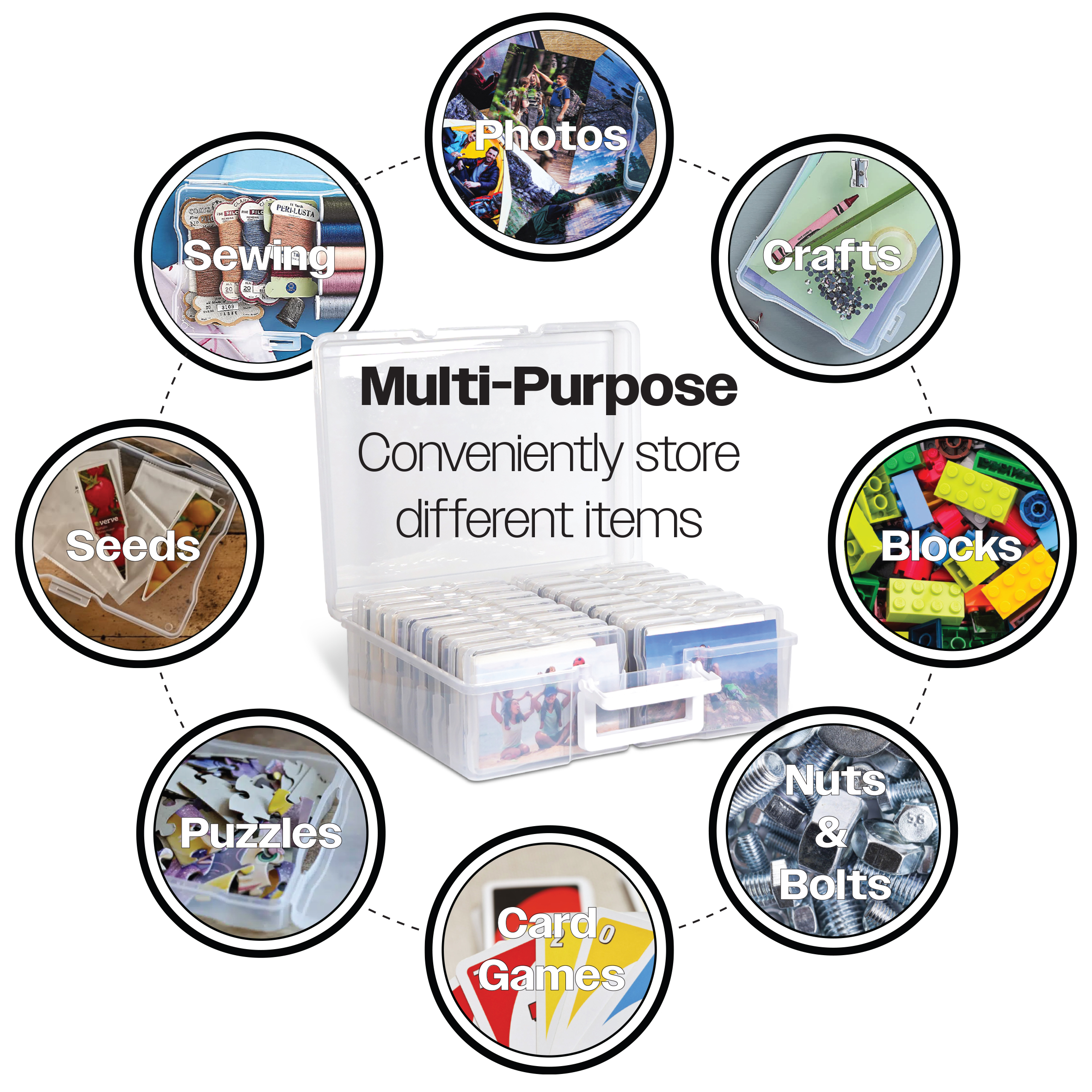 Keep your precious memories and small essentials safe and organized with this Photo Storage 4"x6" Case, supplied with 18 inner storage cases, each capable of holding 100 photos, for a total capacity of 1,800 photos. Made from clear plastic, both the inner and outer boxes provide easy visibility of contents. The outer box features a sturdy carry handle and a hinged lid with a secure clasp fastening on both the inner and outer cases, ensuring reliable protection. Designed for versatility, this storage box can also accommodate seeds, cards, craft supplies, buttons, small components, jigsaw puzzles, stickers, and stationery items. Crafted from durable PE material, it offers strong, robust protection against dust, spills, and damage, making it an essential organizer for any home or office.