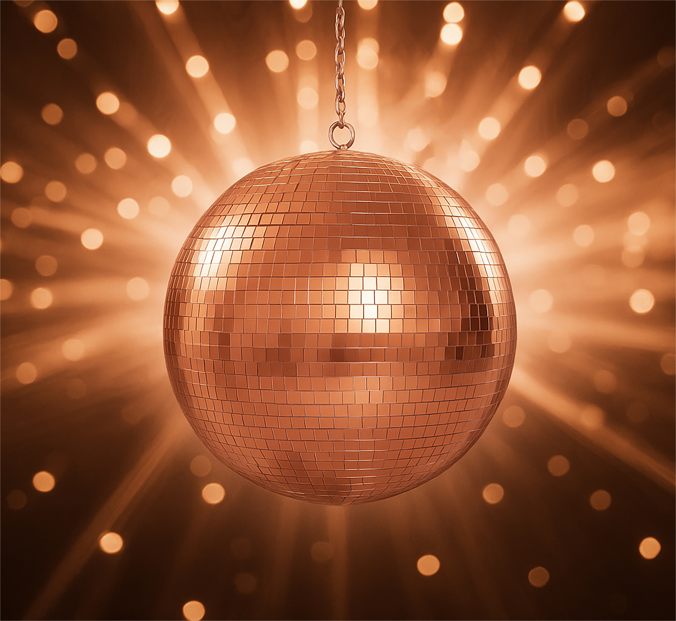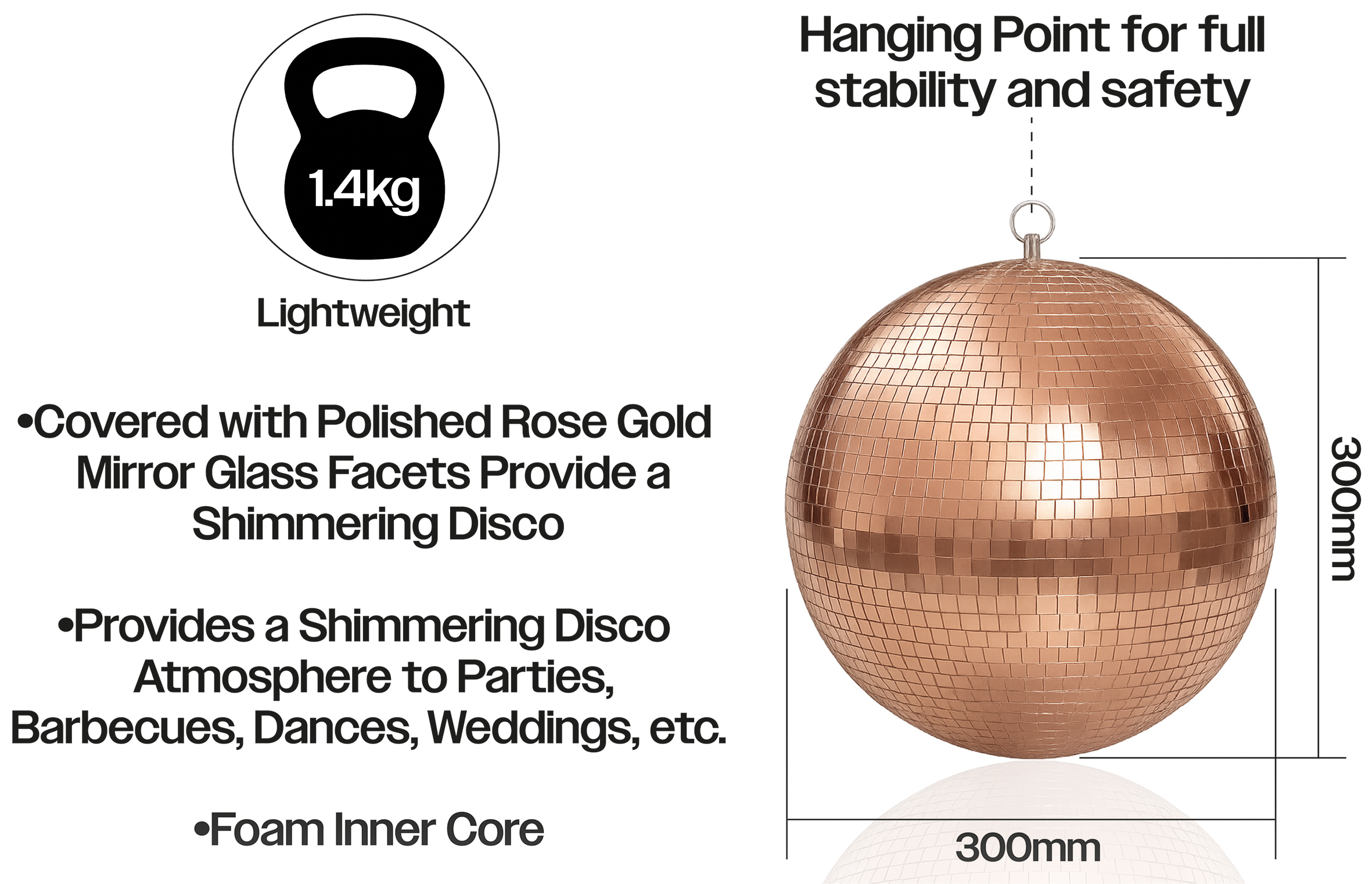 A lightweight rose gold mirror ball which creates a sparkling, shimmering light extravaganza adding an authentic disco atmosphere to parties, barbecues, dances, etc. when a spot light is shined at the ball. Made from lightweight material and covered with polished golden mirrored glass facets.