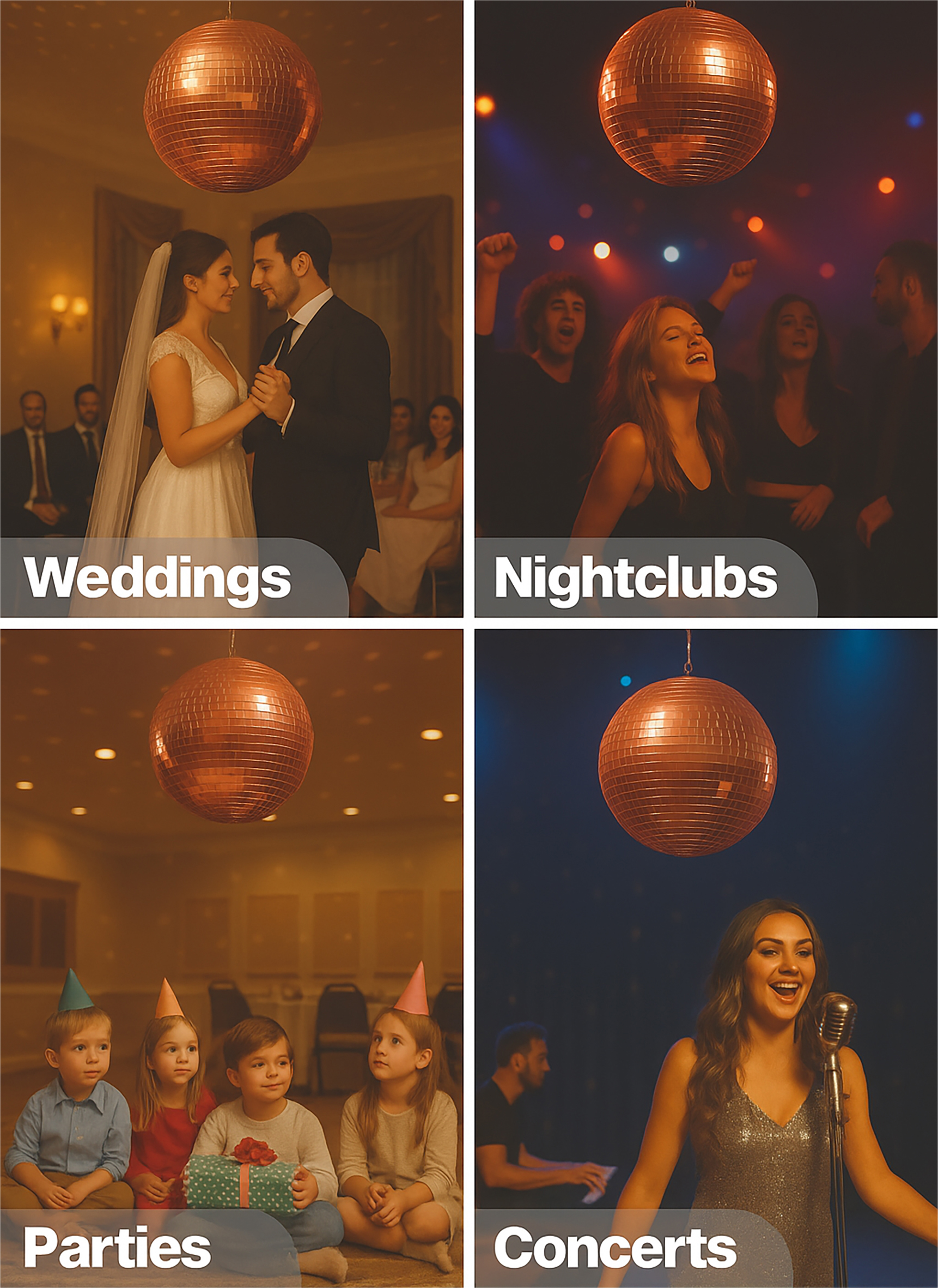 - Provides a shimmering disco atmosphere to parties, barbecues, dances, etc.