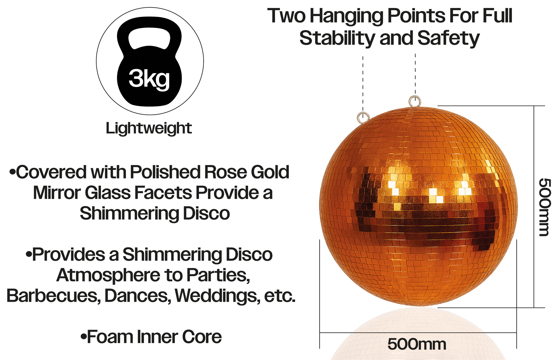 A lightweight rose gold mirror ball made from lightweight material and covered with polished gold mirror glass facets