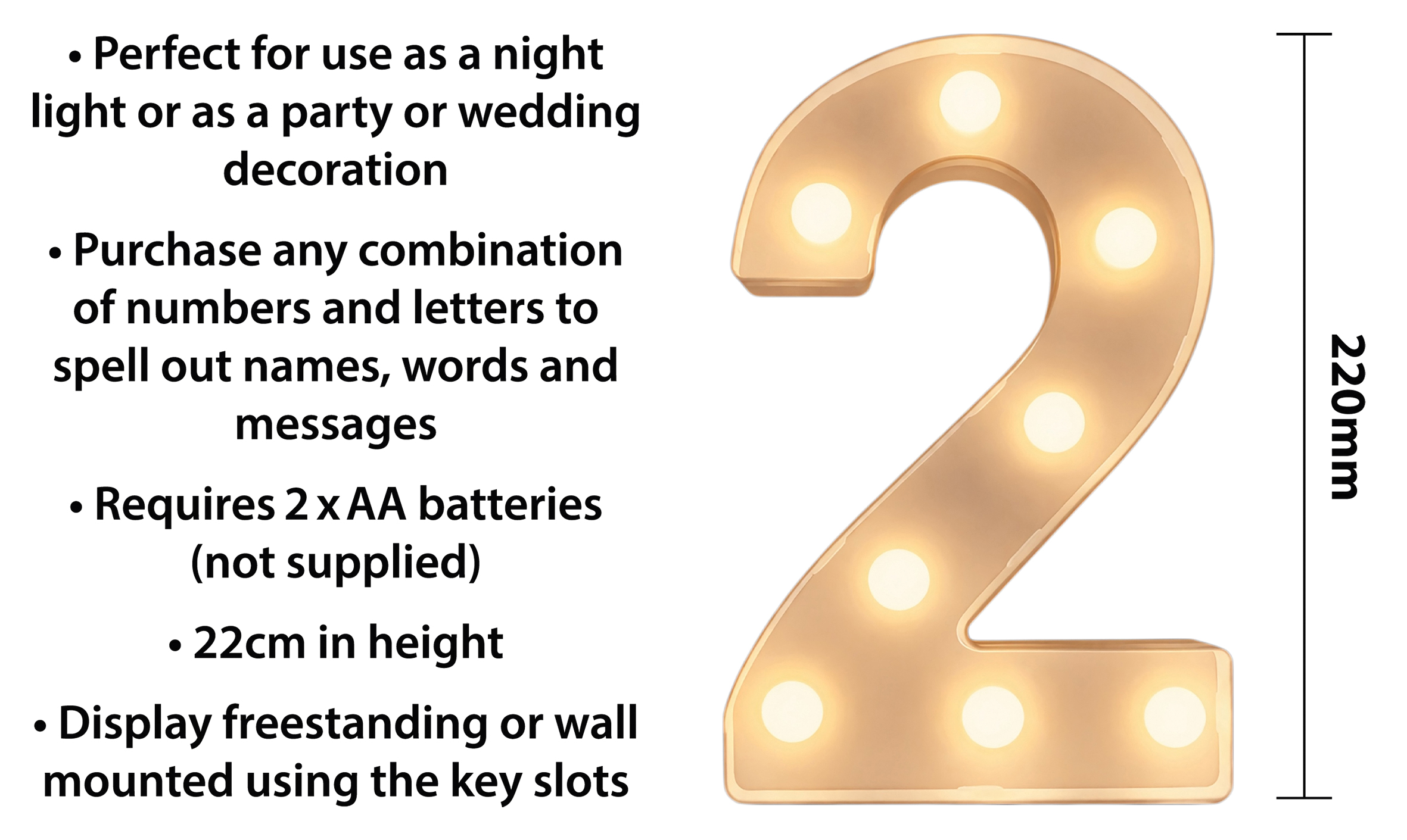 Add a soft, welcoming glow to any space with these battery operated 3D LED number lights. Featuring warm white LEDs, they create a stylish illuminated display that looks great on or off. Perfect for bedrooms, parties, weddings, and special occasions, they can be freestanding or wall mounted and easily mixed with matching LED letters to personalise names, dates, or messages.