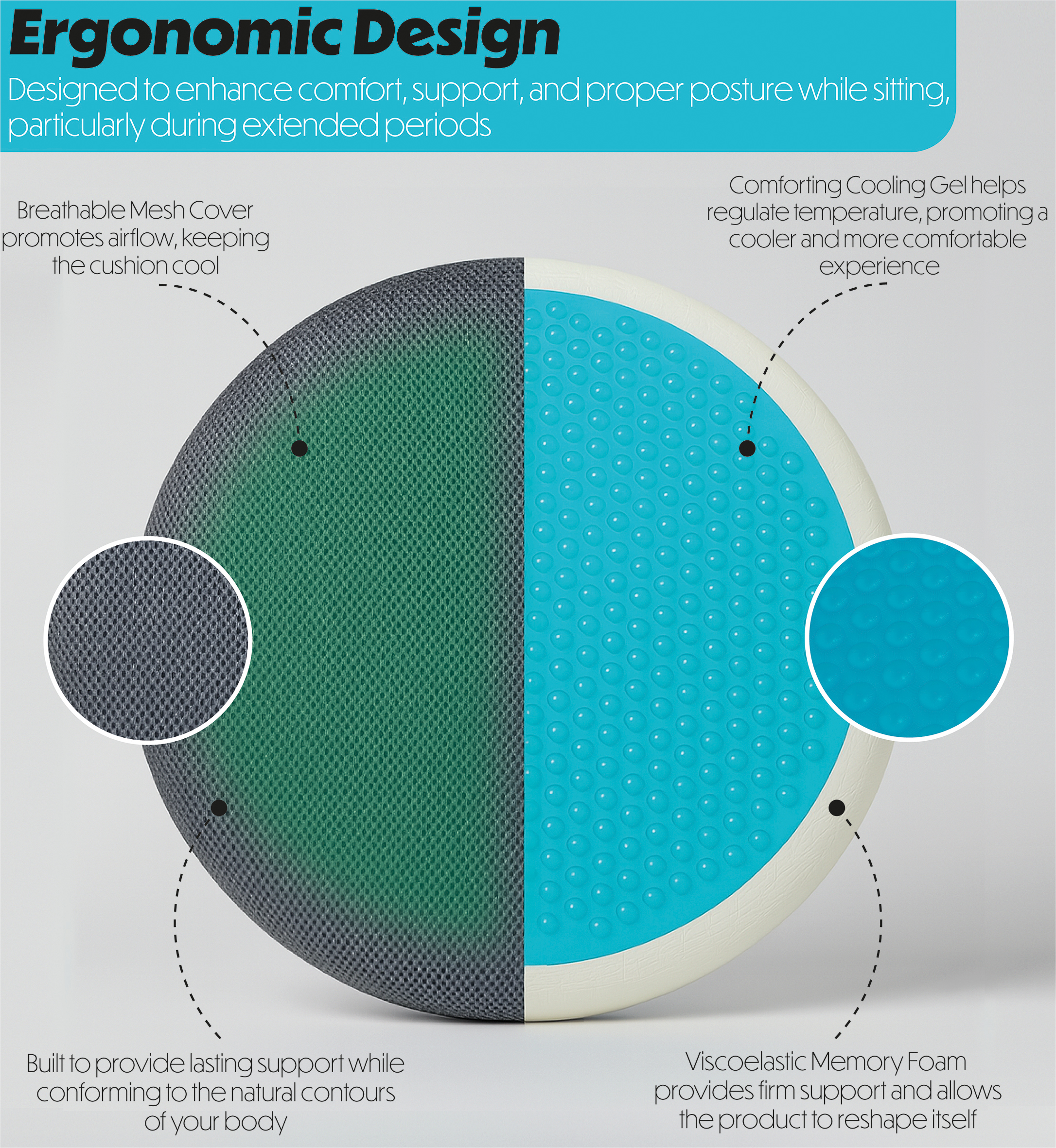 - Cooling Gel Layer – Integrated gel top layer disperses heat and keeps you comfortably cool during extended sitting periods