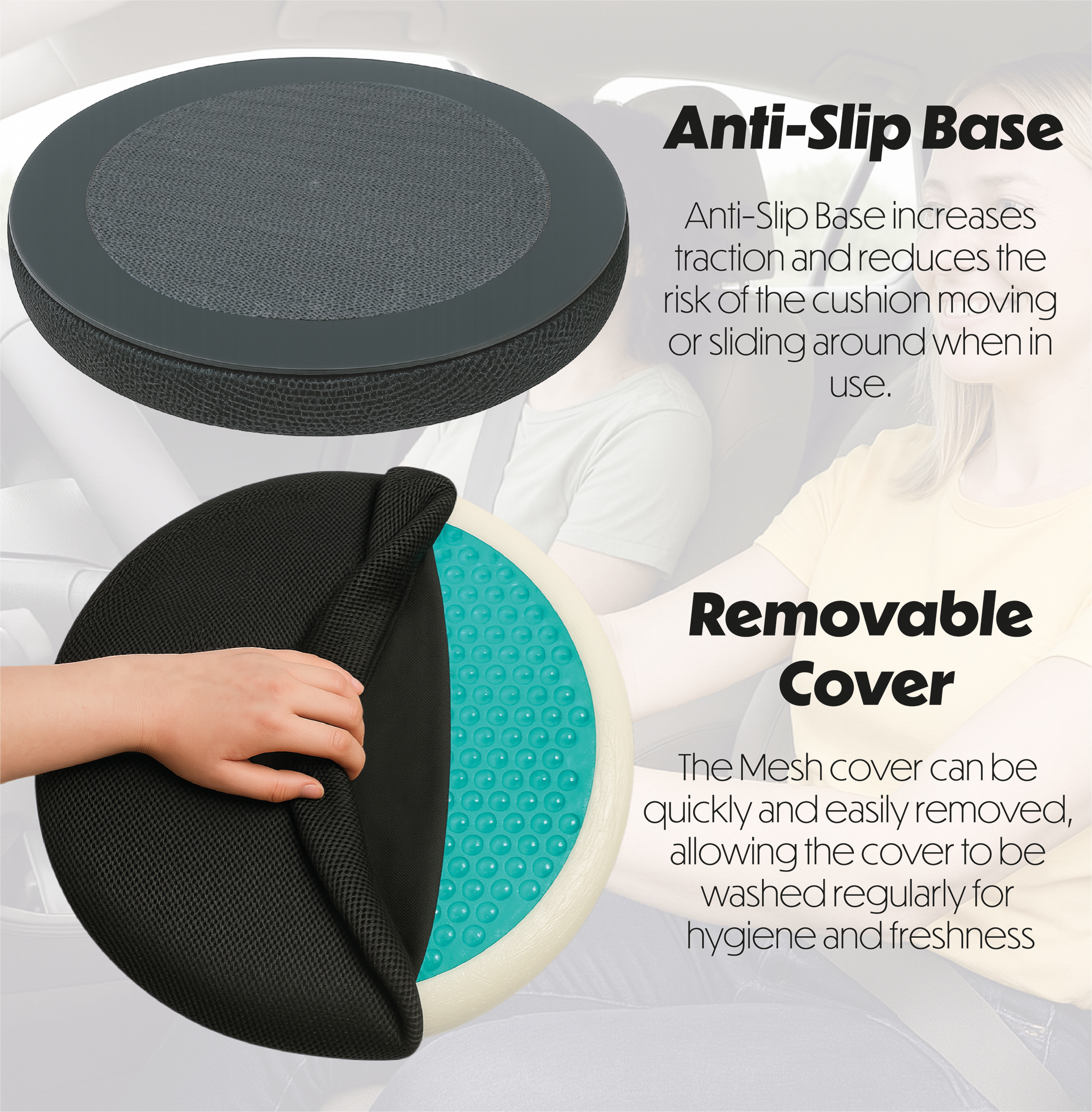 Rotating swivel cushion with premium memory foam and cooling gel layer for easy transfer from chairs, cars etc.