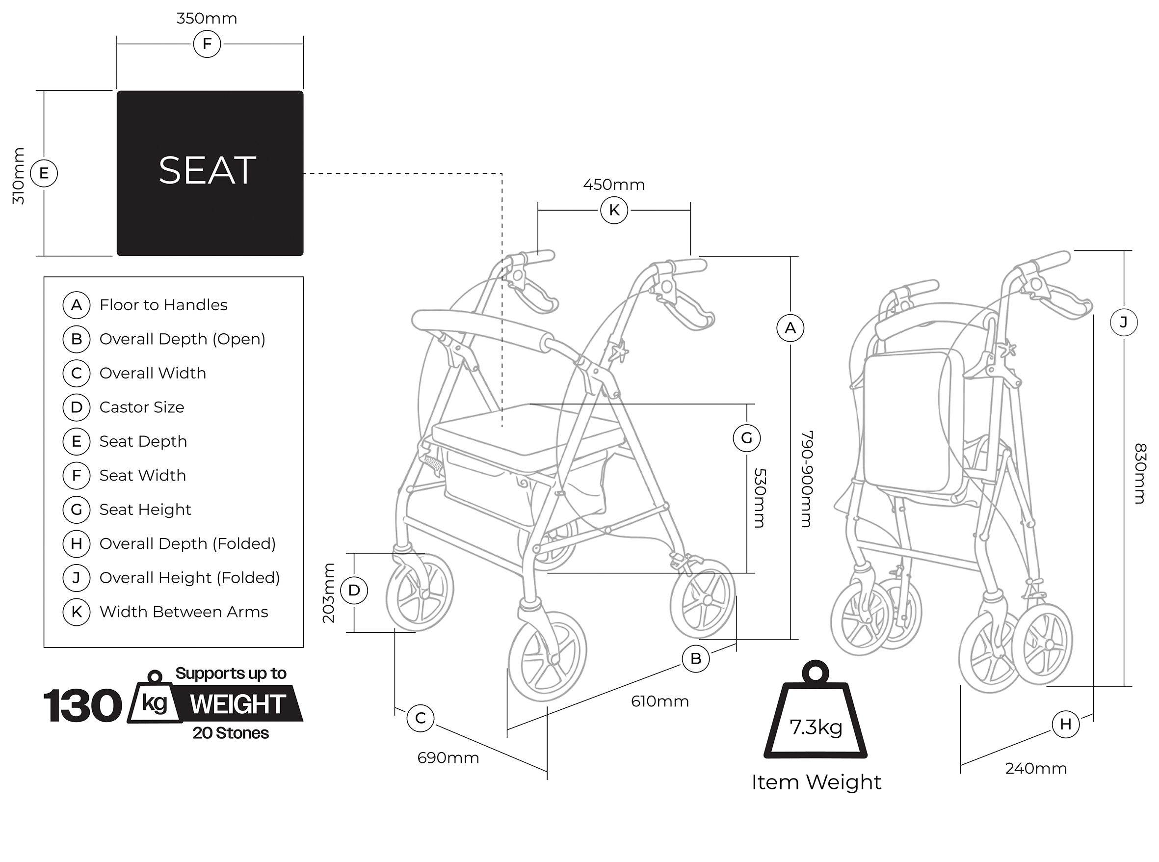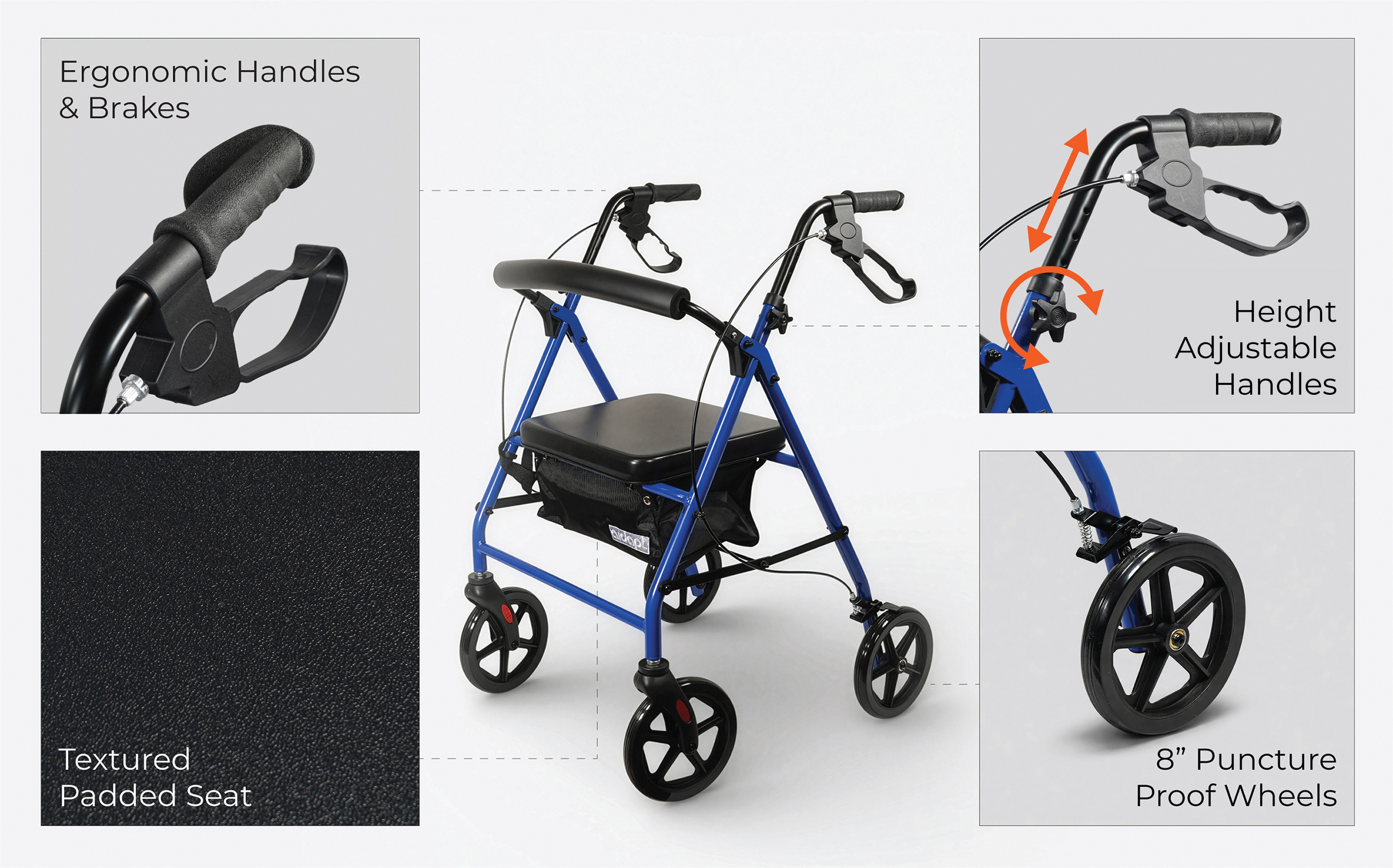 - Height Adjustable Handles – Adjustable from 790–900mm to suit different user heights and promote correct posture while walking