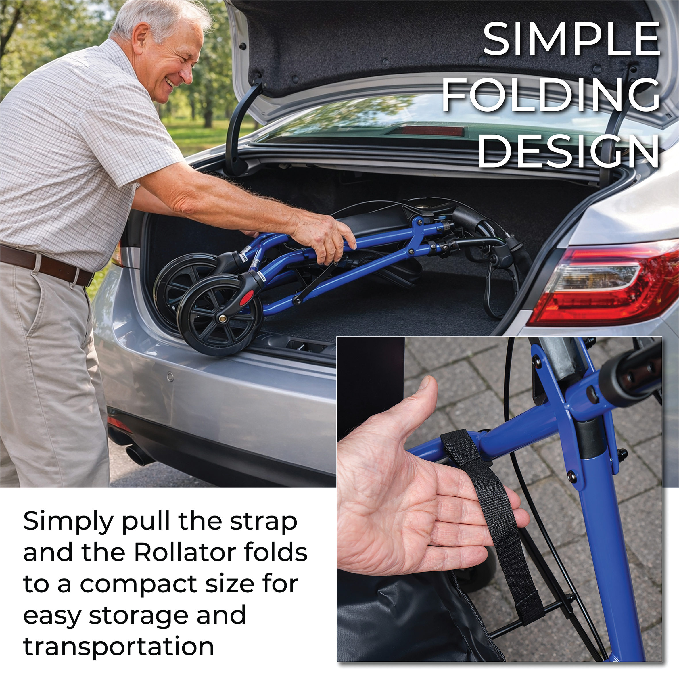 - Comfortable Seat with Storage Bag – Padded seat offers a secure resting place and flips up to reveal a discreet shopping bag for essentials