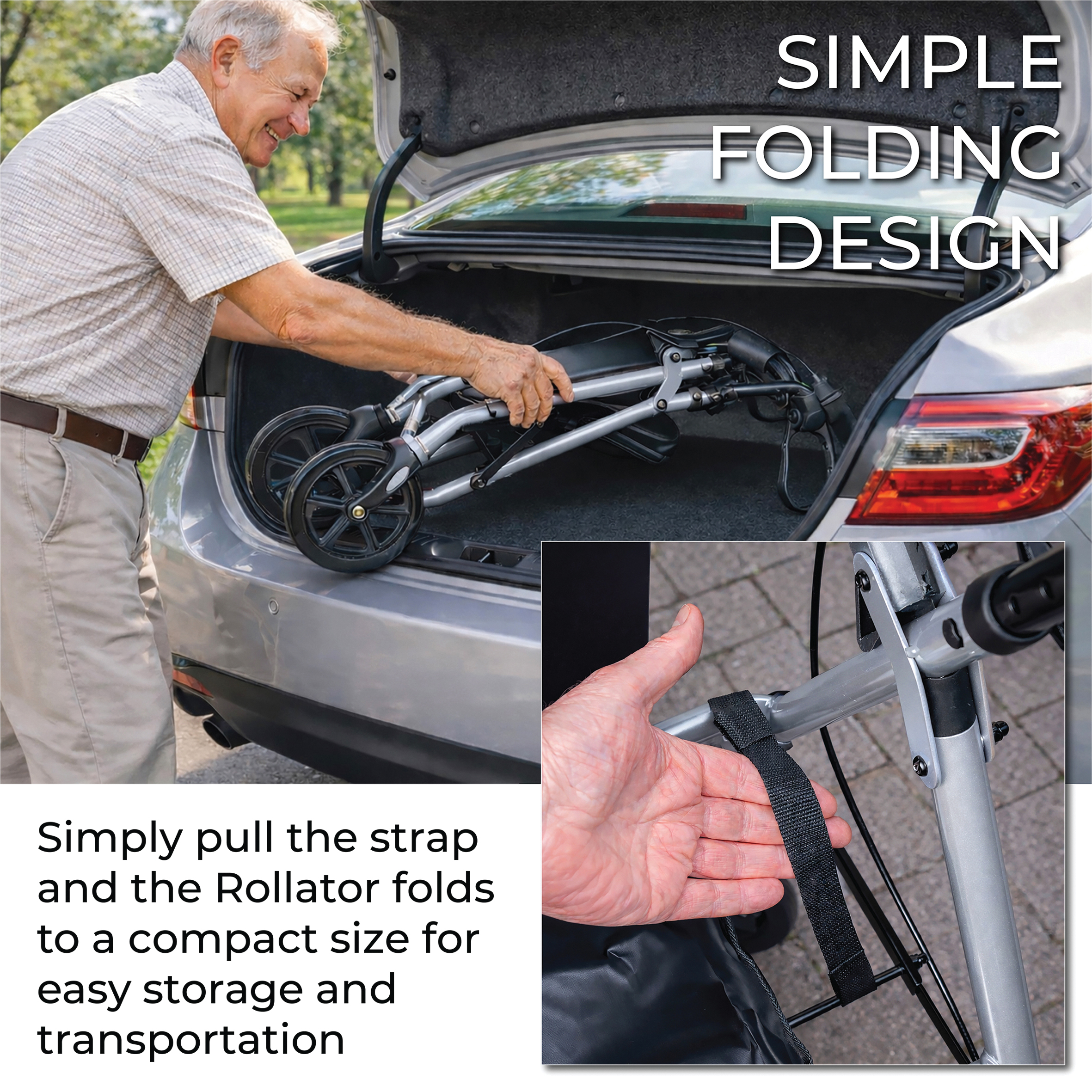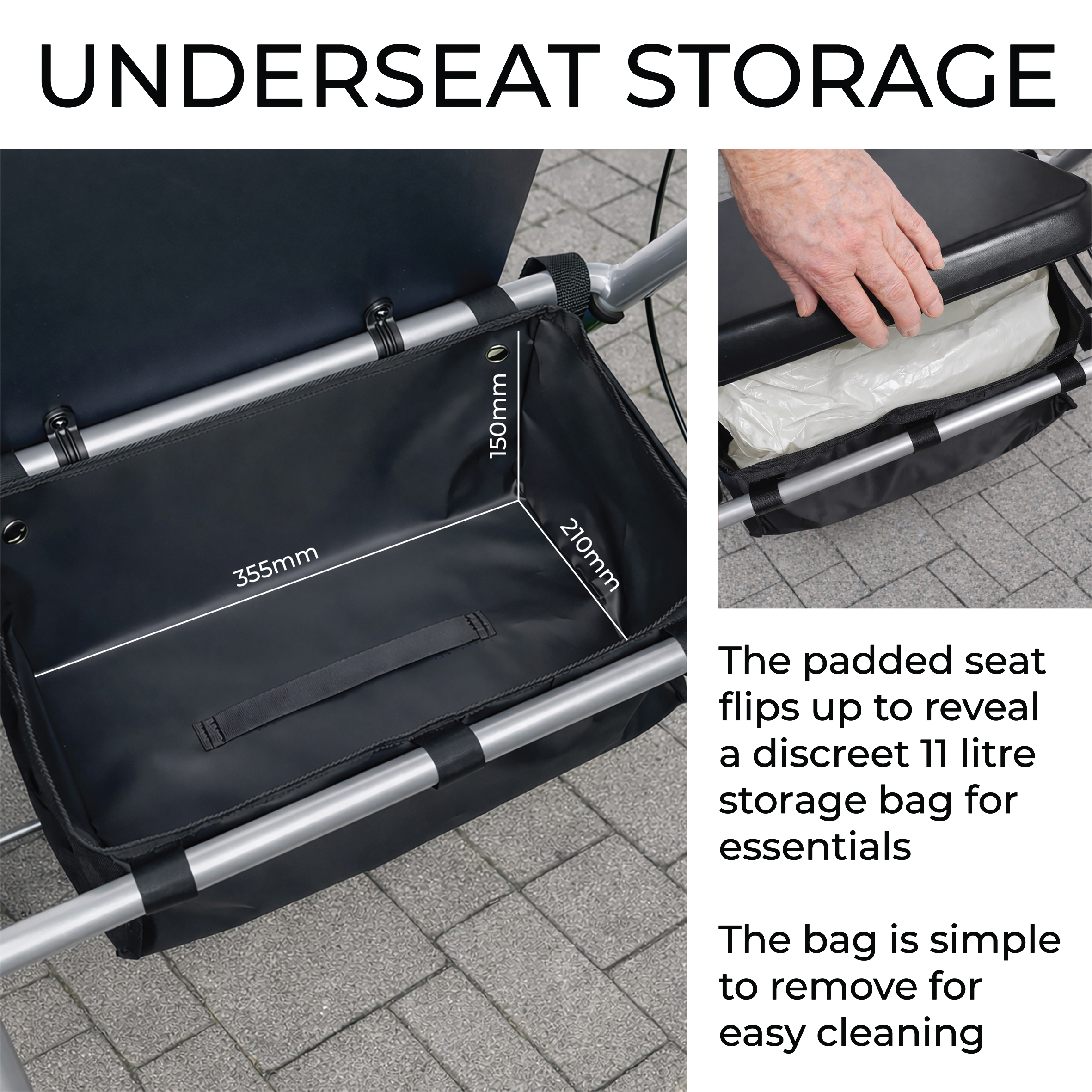 - Comfortable Seat with Storage Bag – Padded seat offers a secure resting place and flips up to reveal a discreet shopping bag for essentials