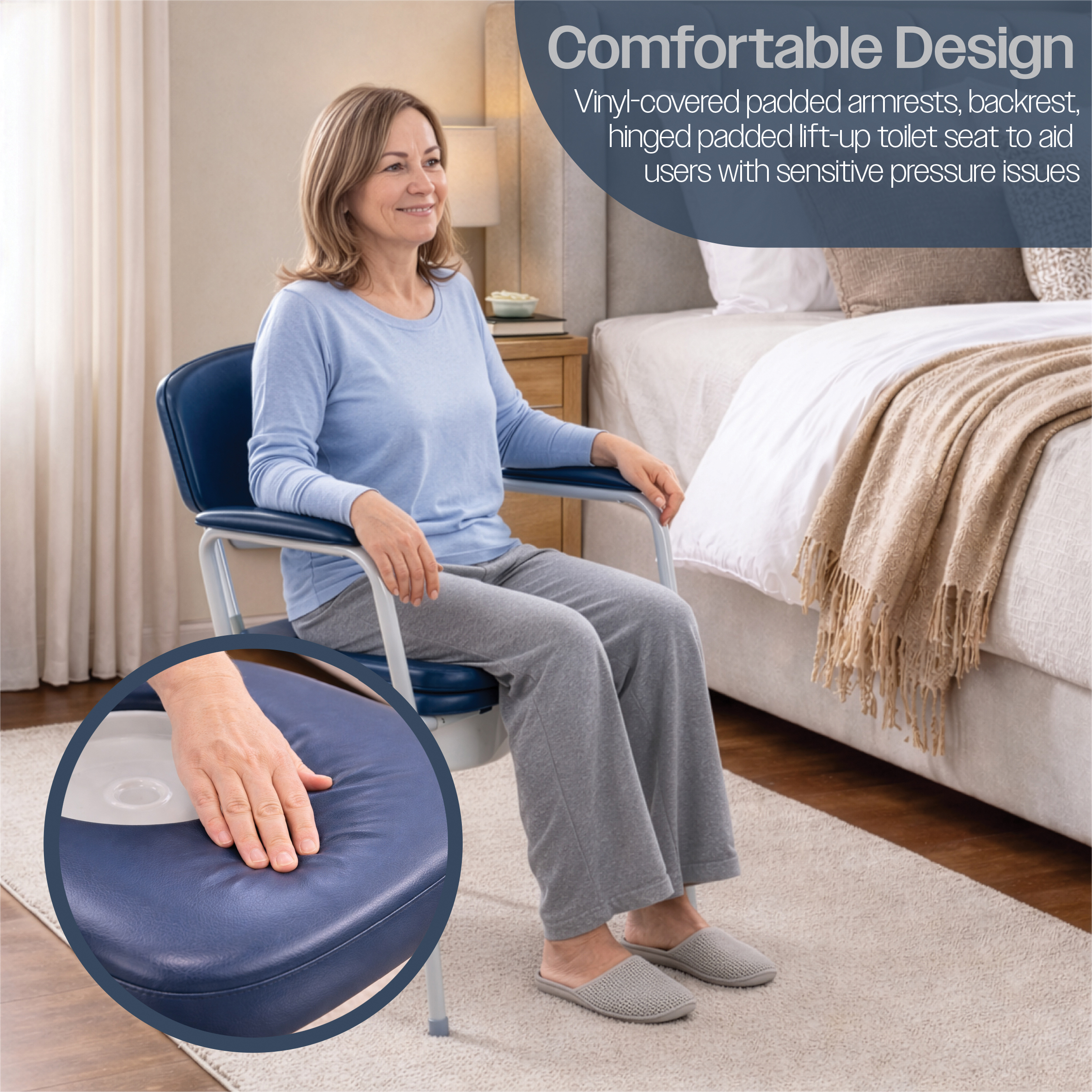 - Comfortable design: Vinyl-covered padded armrests, backrest, and a hinged padded lift-up toilet seat to support users with sensitive pressure-related issues