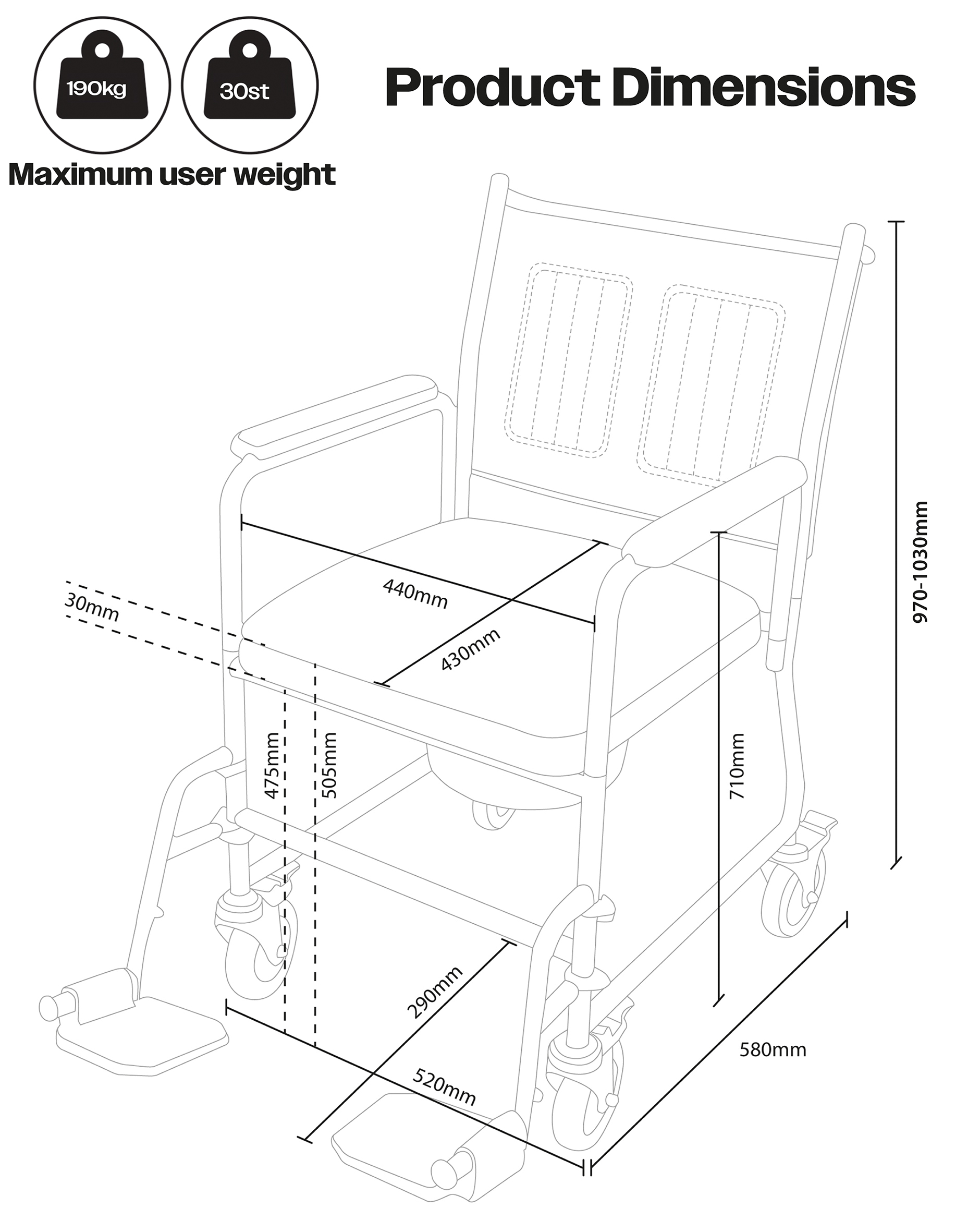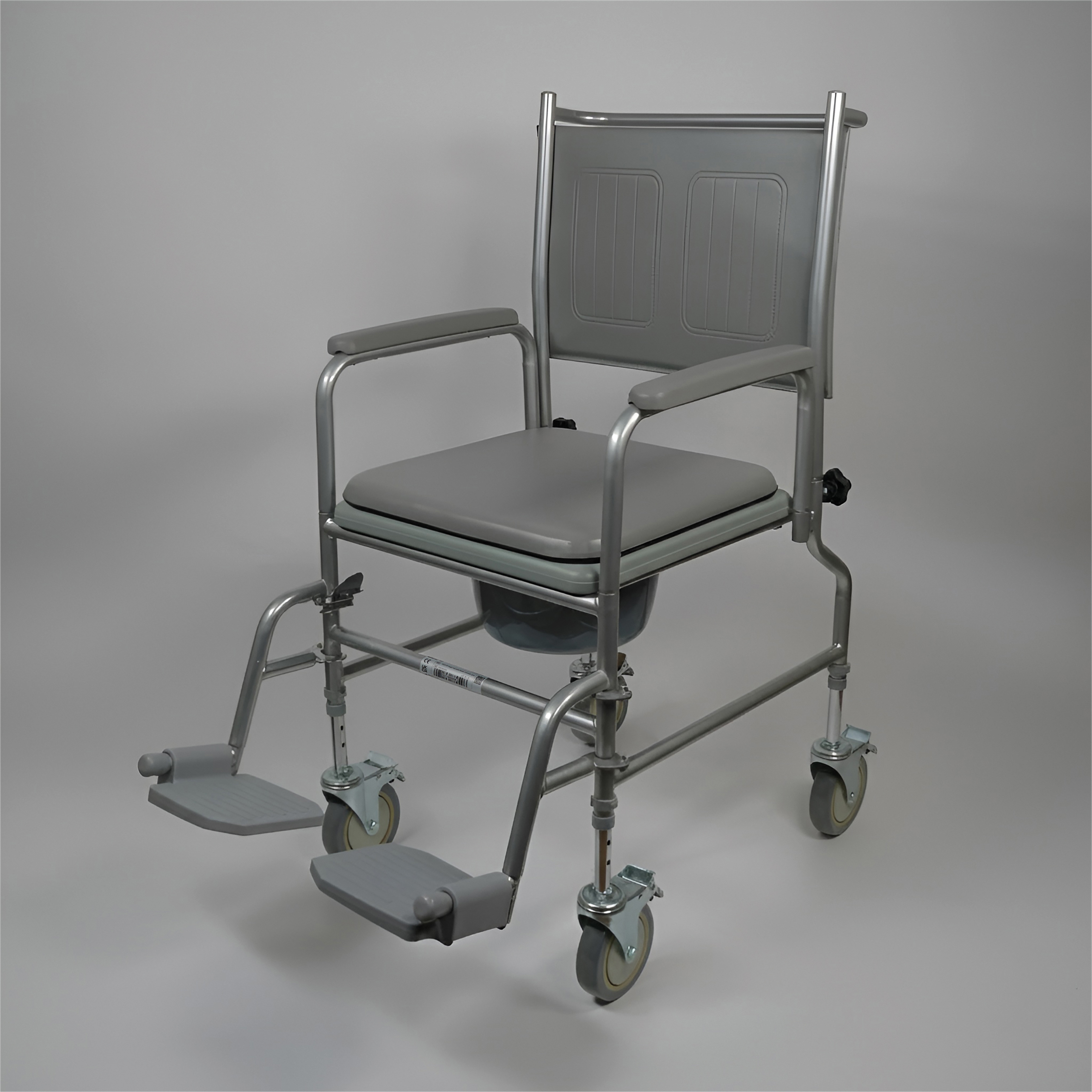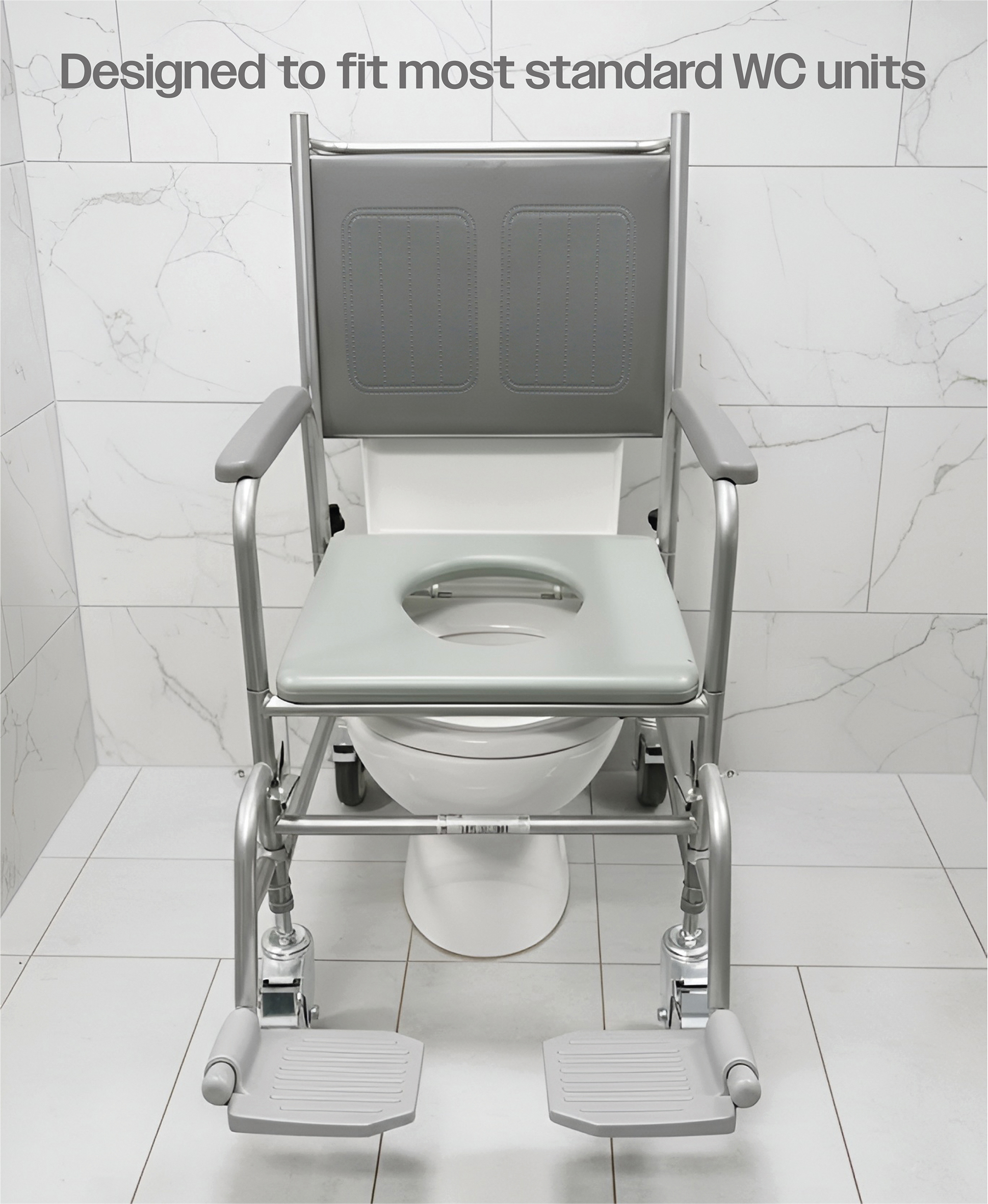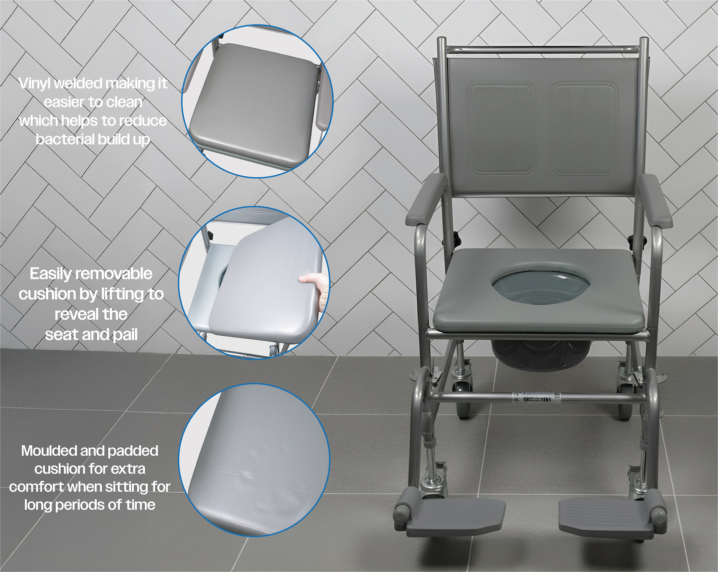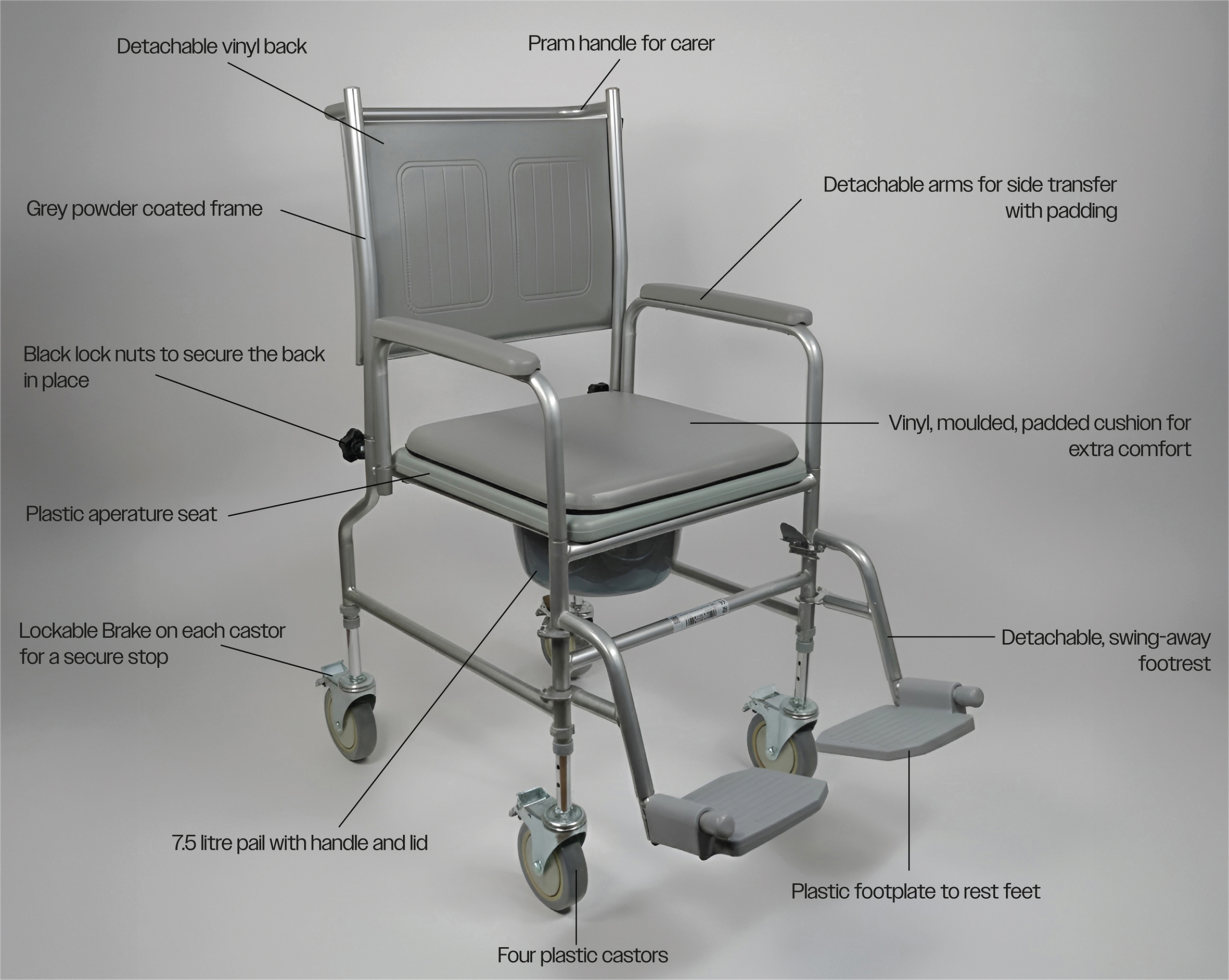 The Height Adjustable Mobile Commode is a versatile and practical solution designed for use in the bedroom, bathroom, or anywhere around the home. Its adjustable height feature allows it to glide effortlessly over most raised toilet seats and clear the majority of cisterns, providing maximum convenience for both users and carers. The seat is constructed from durable blow-moulded ABS plastic, complemented by a padded cushion overseat and backrest. These cushions are vinyl welded to help minimise bacterial build-up, ensuring improved hygiene and easier cleaning.This mobile commode is built with user comfort and carer efficiency in mind. It features detachable arms to enable easy side transfers, a pram-style handle for smooth manoeuvring, and four 5" braked castors for added stability and safety during use. A 7.5-litre capacity pail with a sturdy metal handle and secure lid is included for easy and hygienic disposal. With a maximum user weight limit of 190kg (30 stone), it offers robust support for a wide range of users. Available in a chrome-plated or powder-coated grey finish, it combines strength, practicality, and a professional appearance to suit various home and care settings.