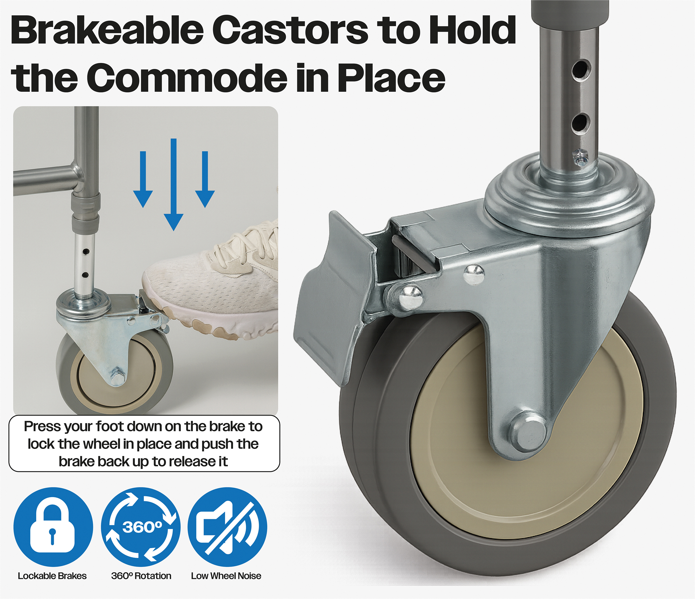 - WHEELED; Four braked castors to hold commode in place during transfer for safety